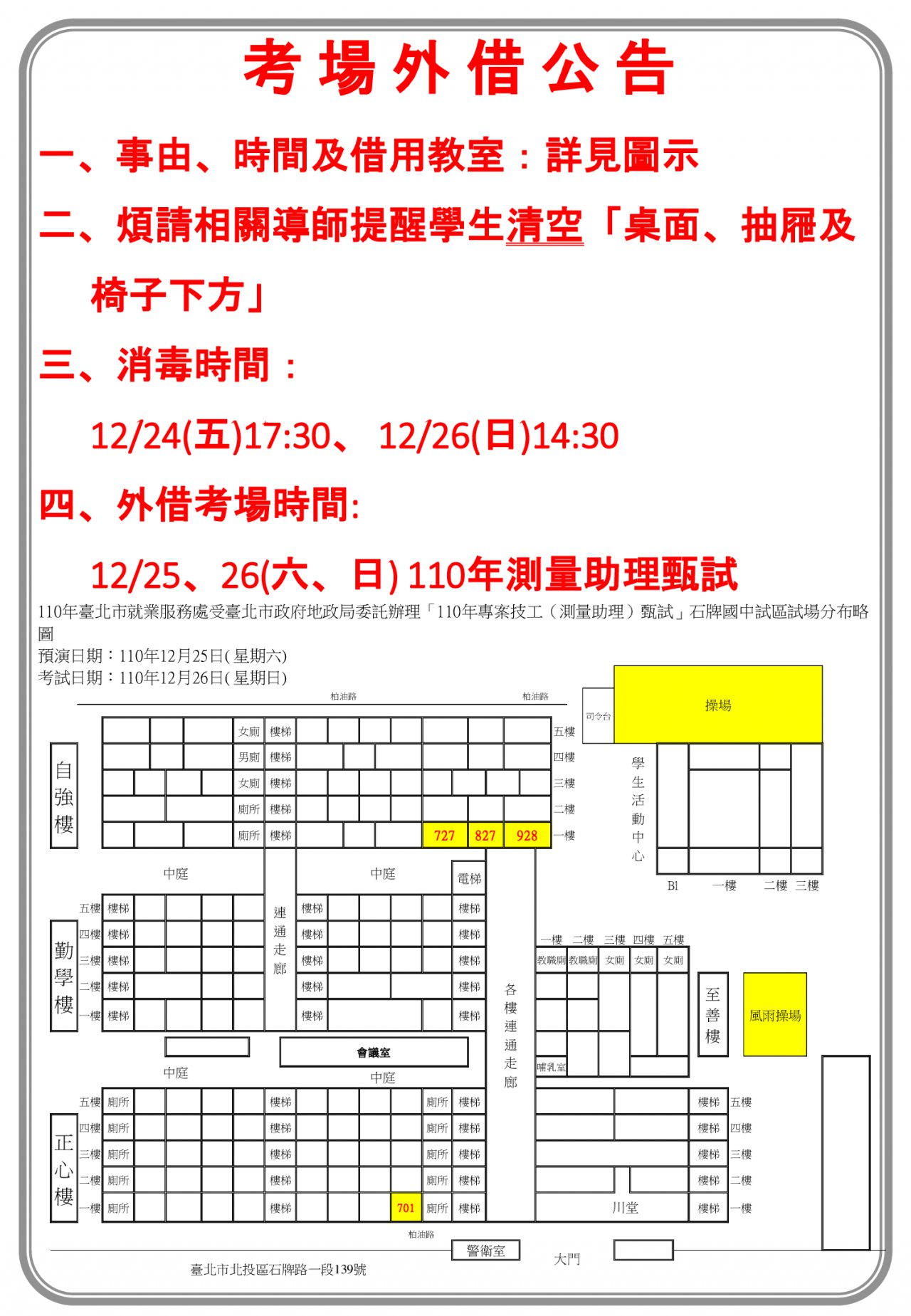 因本校12月25、26日(六、日)外借考場辦理110年專案技工(測量助理)甄試,
