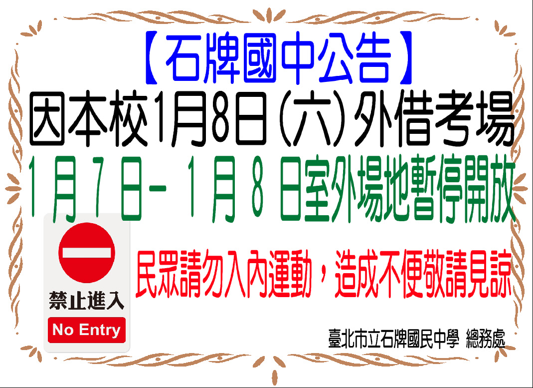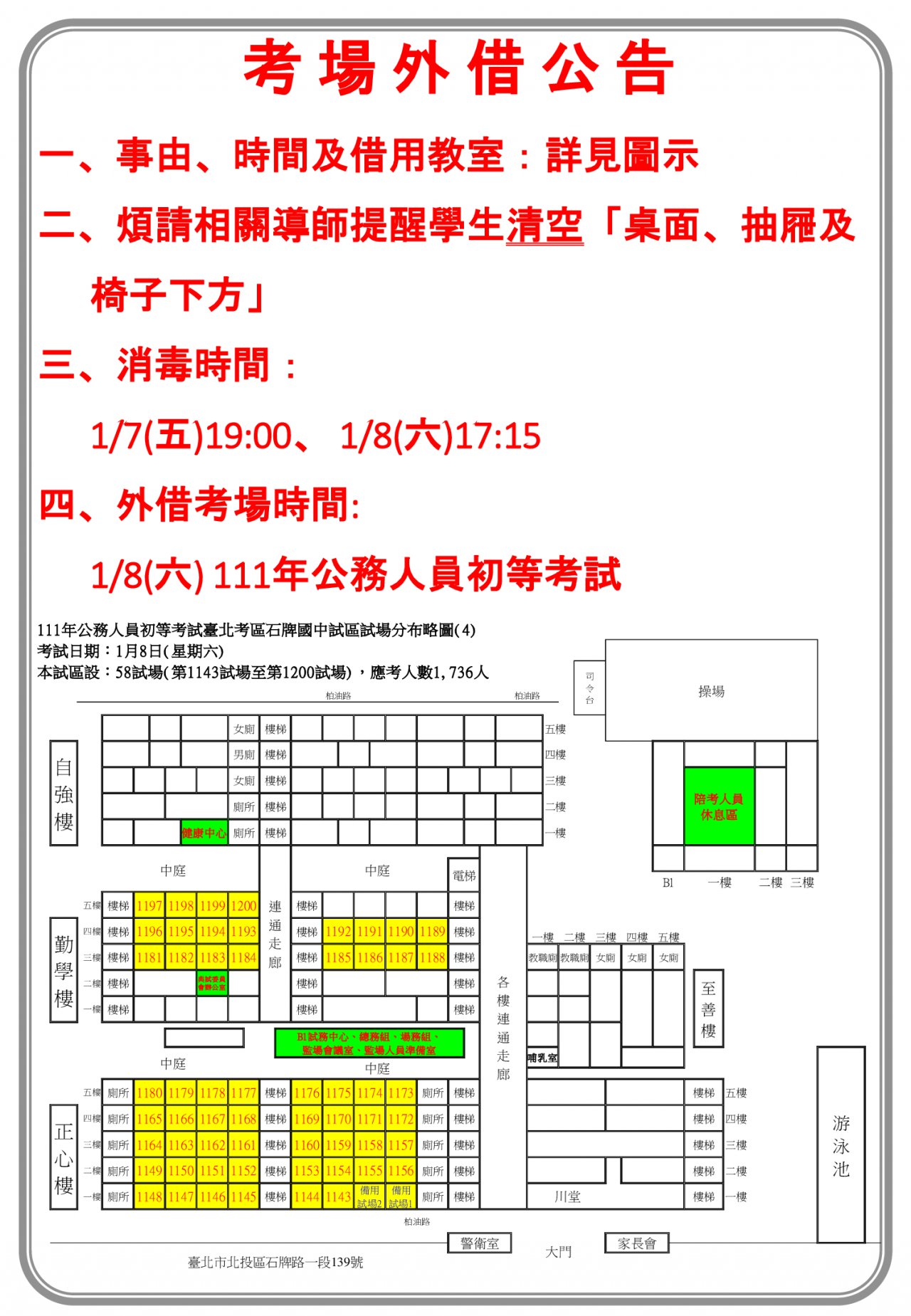 因本校1月8日(六)外借考場辦理111年公務人員初等考試,
