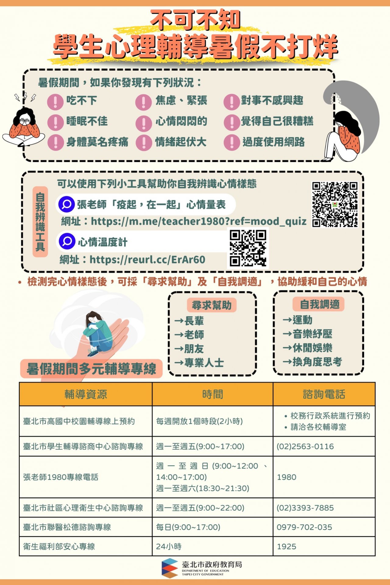 另外,臺北市提供學生心理輔導暑假不打烊資訊,歡迎大家多加利用!!!