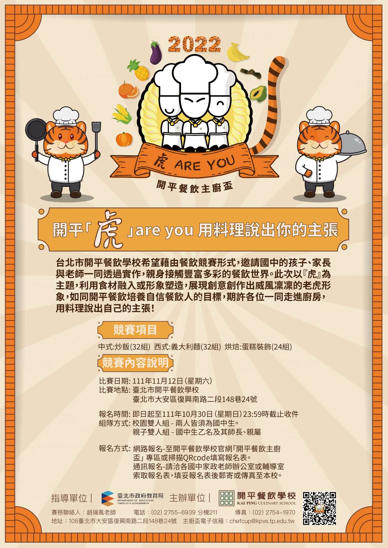 一、本次活動目的: (一)提升餐飲文化向下紮根。 (二)開啟親子互助合作平台,增進家庭親子關係。 (三)認識餐飲教育,提供職涯探索。 二、本屆比賽類別:分「中式炒飯」、「義大利麵」及「蛋糕裝飾」三項。藉由「開平『虎』are you」為主題,老虎具威風凜凜的大眾印象,如同開平餐飲培養自信餐飲人的目標,邀請喜愛餐飲的國中生,能內觀自身興趣發展,並依主題盡情發揮創意,以料理展現自我、創造未來無限可能。