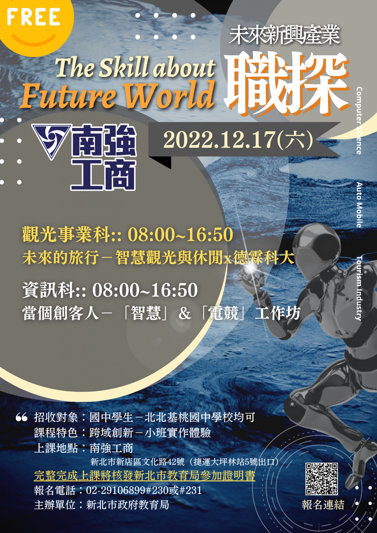 五、報名:即日起報名,方式如下(一)網路報名:https://reurl.cc/gQzx6V(二)電話報名:02-29106899分機231、235實習處。 六、完成「未來興新產業職業試探課程」由新北市教育局核發參加證明書,當升學參加新北市特招入學管道時可做書審加分佐證。