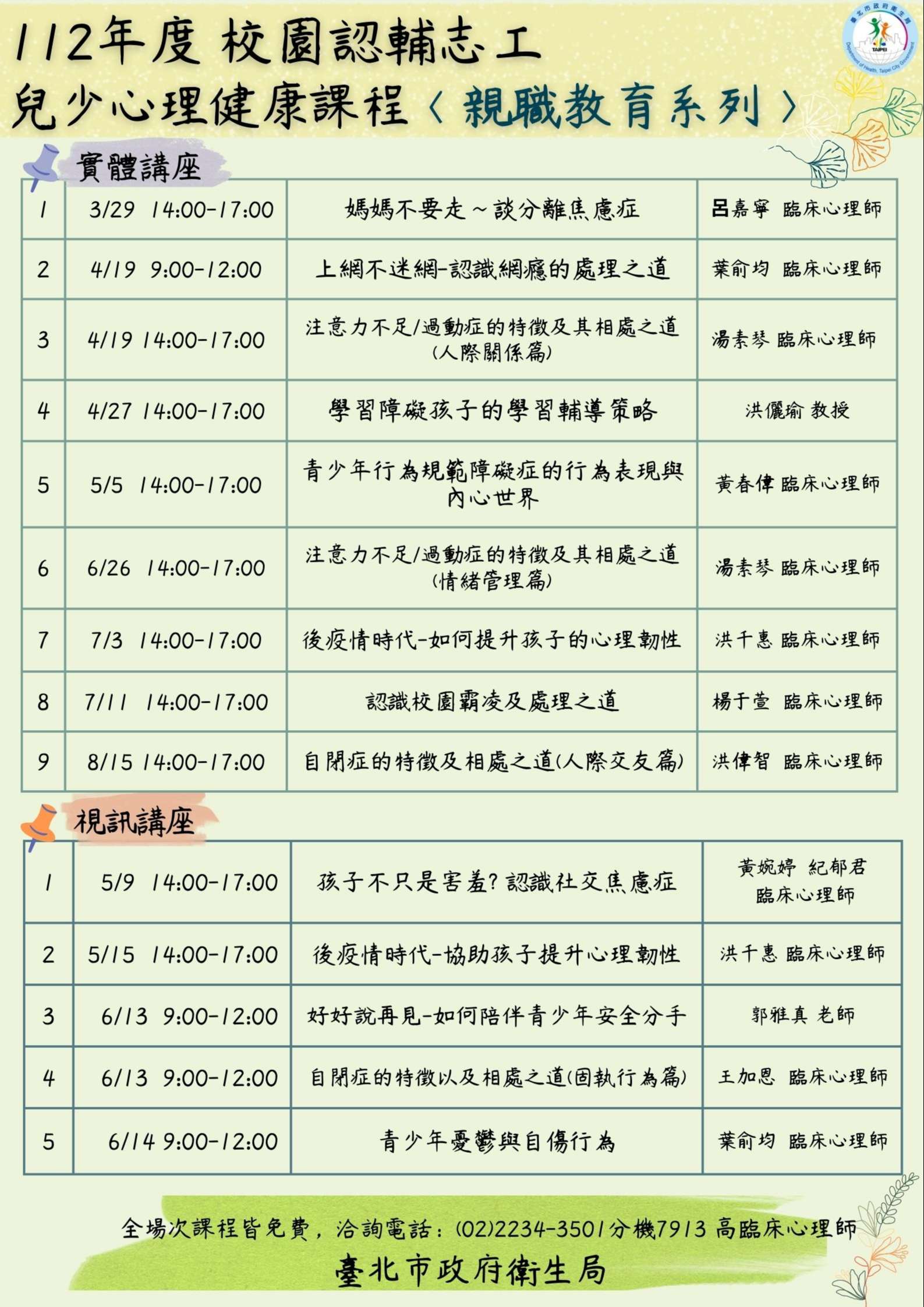 (四)報名網址:https://mental-health.gov.taipei/(臺北市社區心理衛生中心官網-報名專區-講座/活動)。