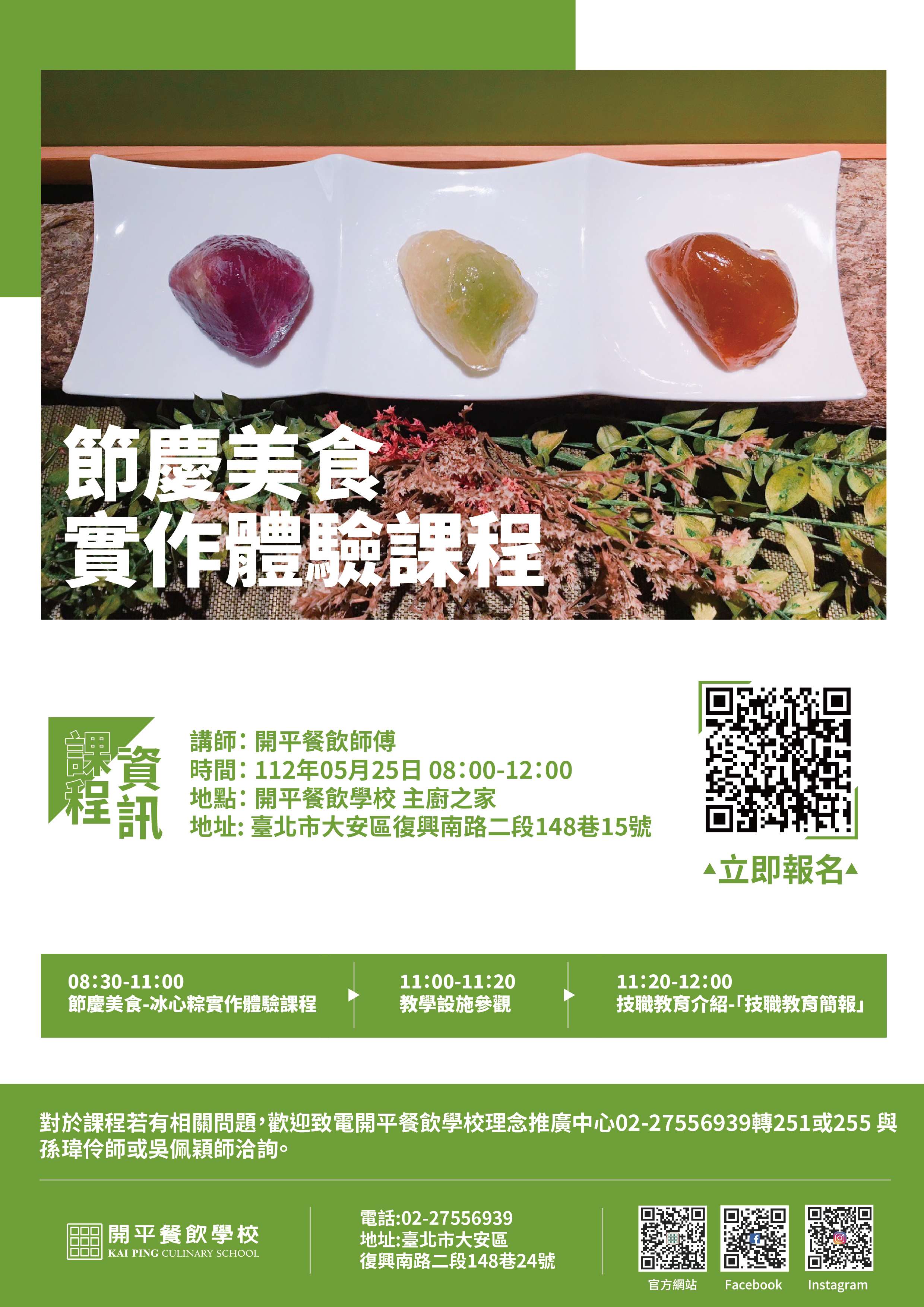 一、為協助國中教師認識技職體系之學習內容、教學特色及進路發展。本次活動融入「節慶美食_端午節冰心粽」,透過實作體驗更加了解技職體系,進而發揮協助學生適性就學選擇之輔導。
