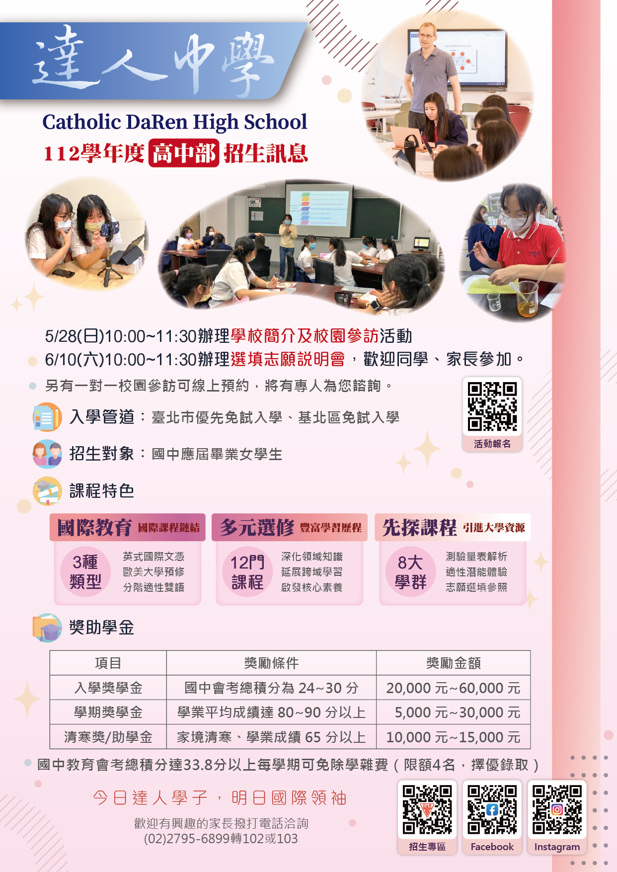 三、另本校於5月28日星期日上午10:00~11:30辦理學校簡介及校園參訪活動,6月10日星期六上午10:00~11:30辦理志願選填說明會,歡迎九年級女學生及家長踴躍報名參加,活動報名連結為https://forms.gle/nNmxRxATjNAfRvdg9。