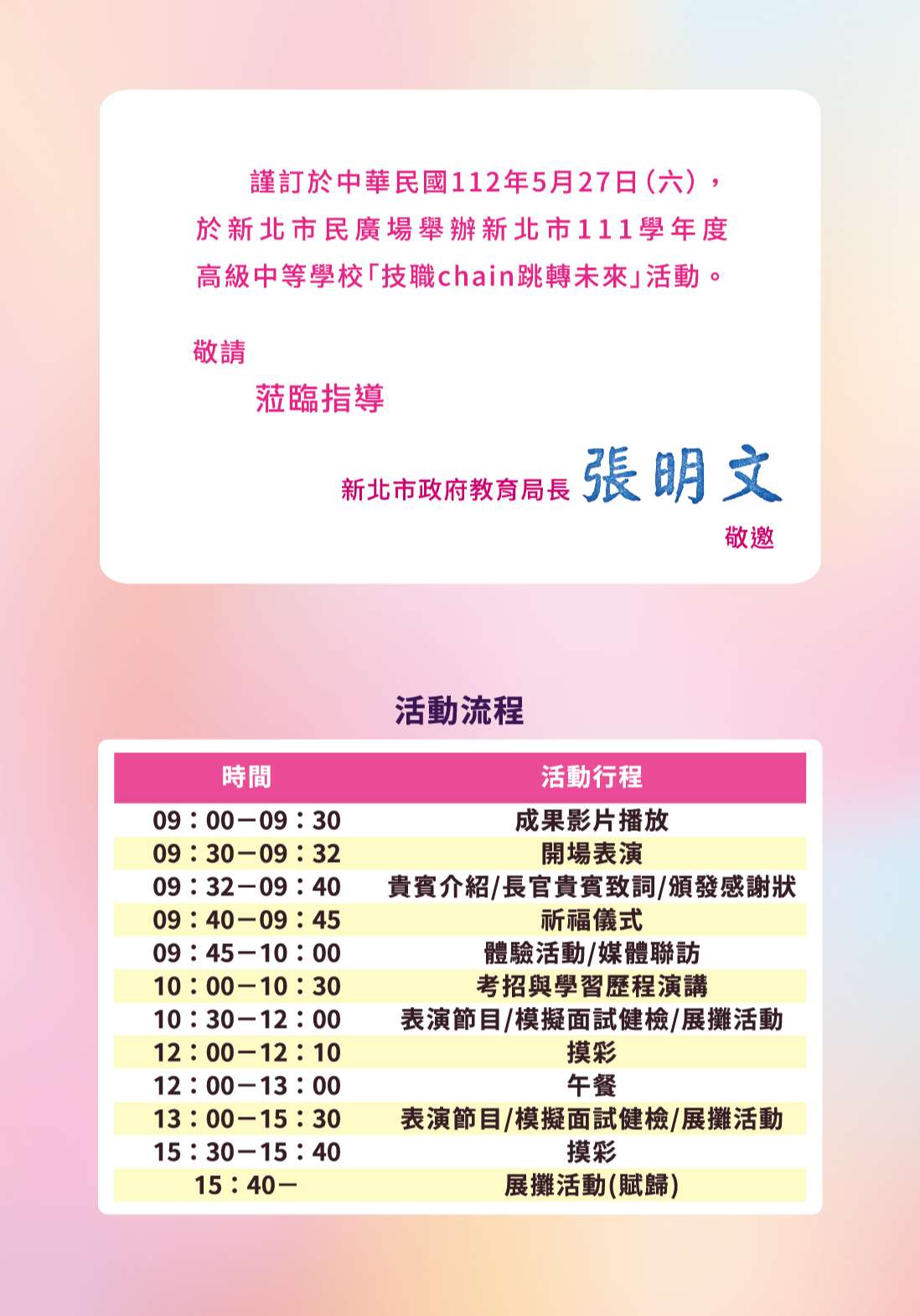 一、依據新北市111學年度高級中等學校「技職Chain 跳轉未來」活動實施計畫辦理。