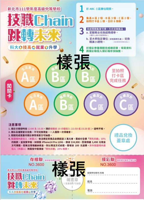 (五)參加活動現場10場次任一場次的技職宣導,可獲精美小禮物兌換券,各項禮品數量有限送完為止。