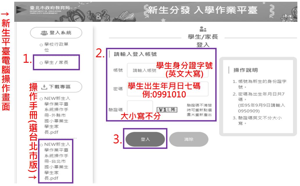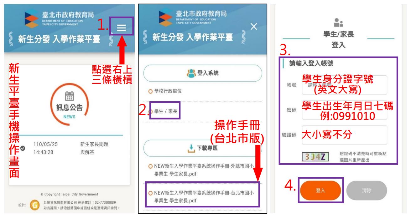 2.操作:請參閱操作手冊「臺北市國小畢業生(學生家長手機/網頁版)」(如下附件,請看「新生登記網路報到」部分即可)。