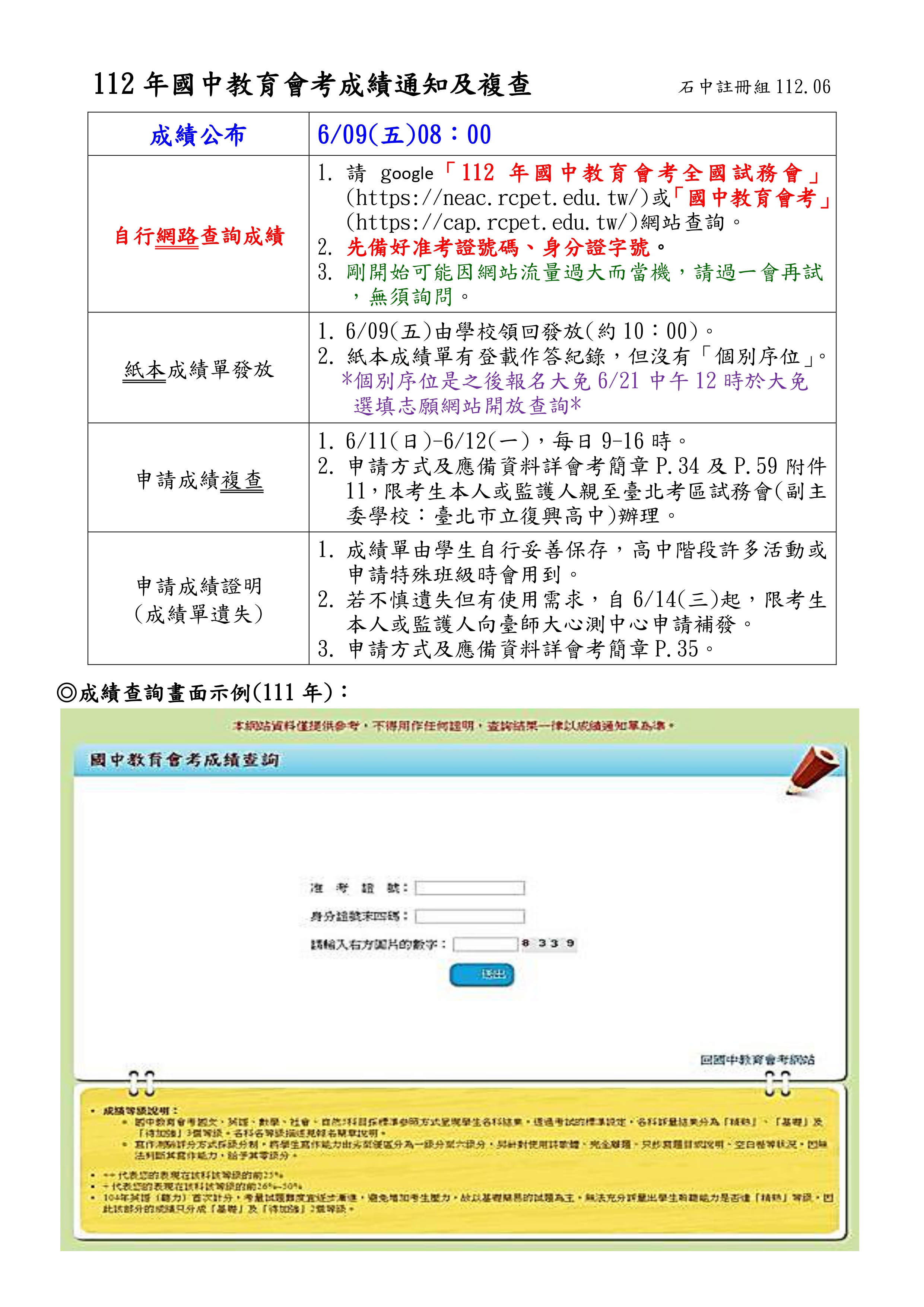 國中教育會考成績查詢: 請點 https://reurl.cc/GAEZyv