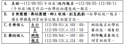 112學年舉辦臺北市政府五項藝術比賽,有意願參加各類比賽的同學,請注意以下校內報名時程。