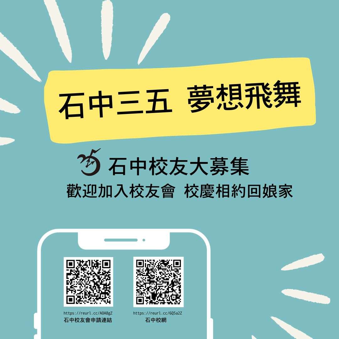石中35週年校慶即將到來,誠摯邀請您在112/11/04(星期六)回到母校,相約敘舊同歡!一起觀賞隆重的開幕典禮,並為參加大隊接力及才藝秀表演的學弟妹加油喝采!豐富熱鬧的園遊會、展現學習成果的藝文展、考驗腦力及團隊合作的Super Go競賽…豐富多元的活動讓校園熱鬧滾滾!敬請蒞臨石中,喚起青春回憶,歡慶石中生日快樂!