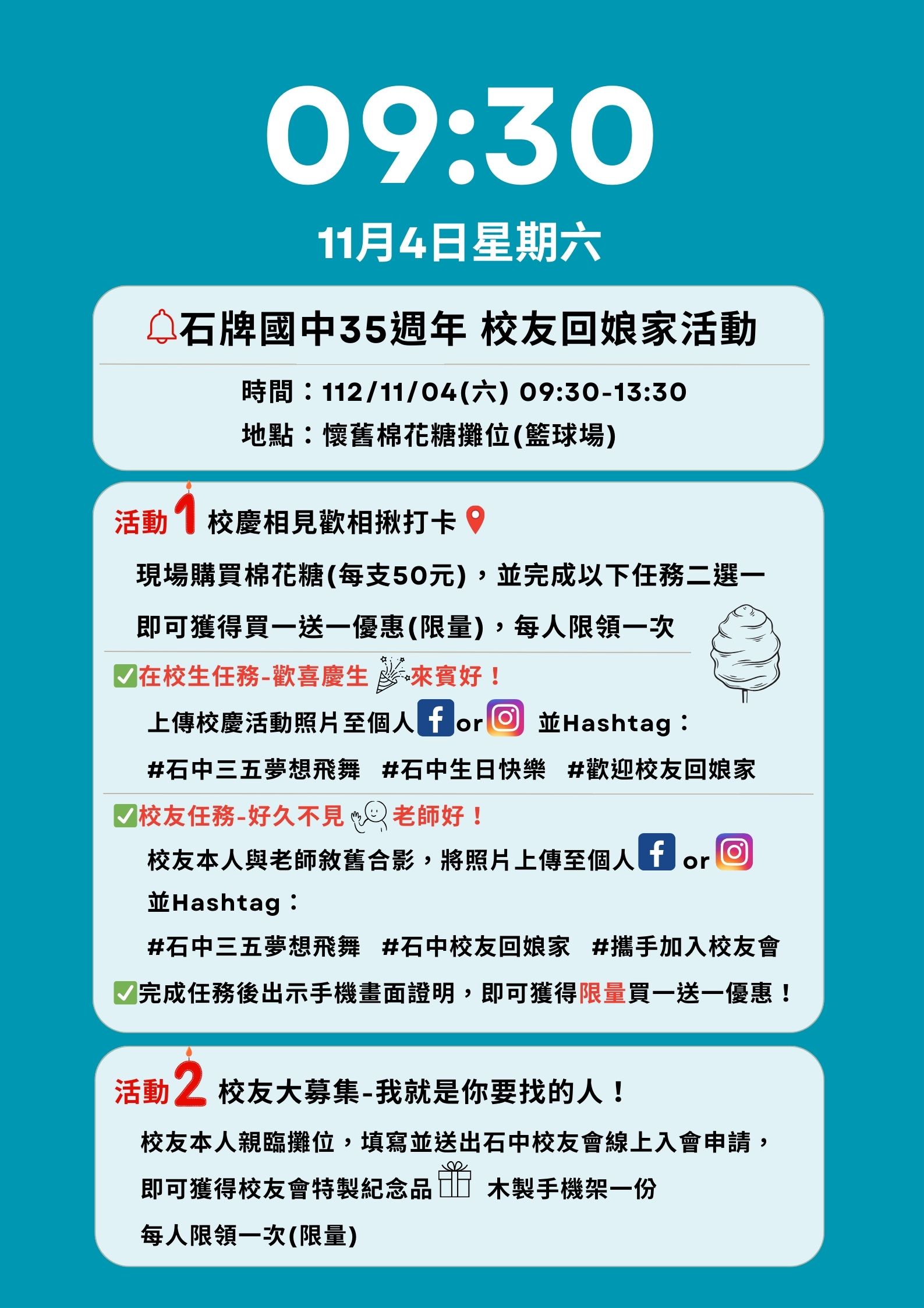 今年校慶特別策劃「石中校友回娘家活動」,歡迎校友前往活動攤位,現場參與拍照打卡活動、申請加入校友會,有機會獲得限量好康優惠,敬請把握!