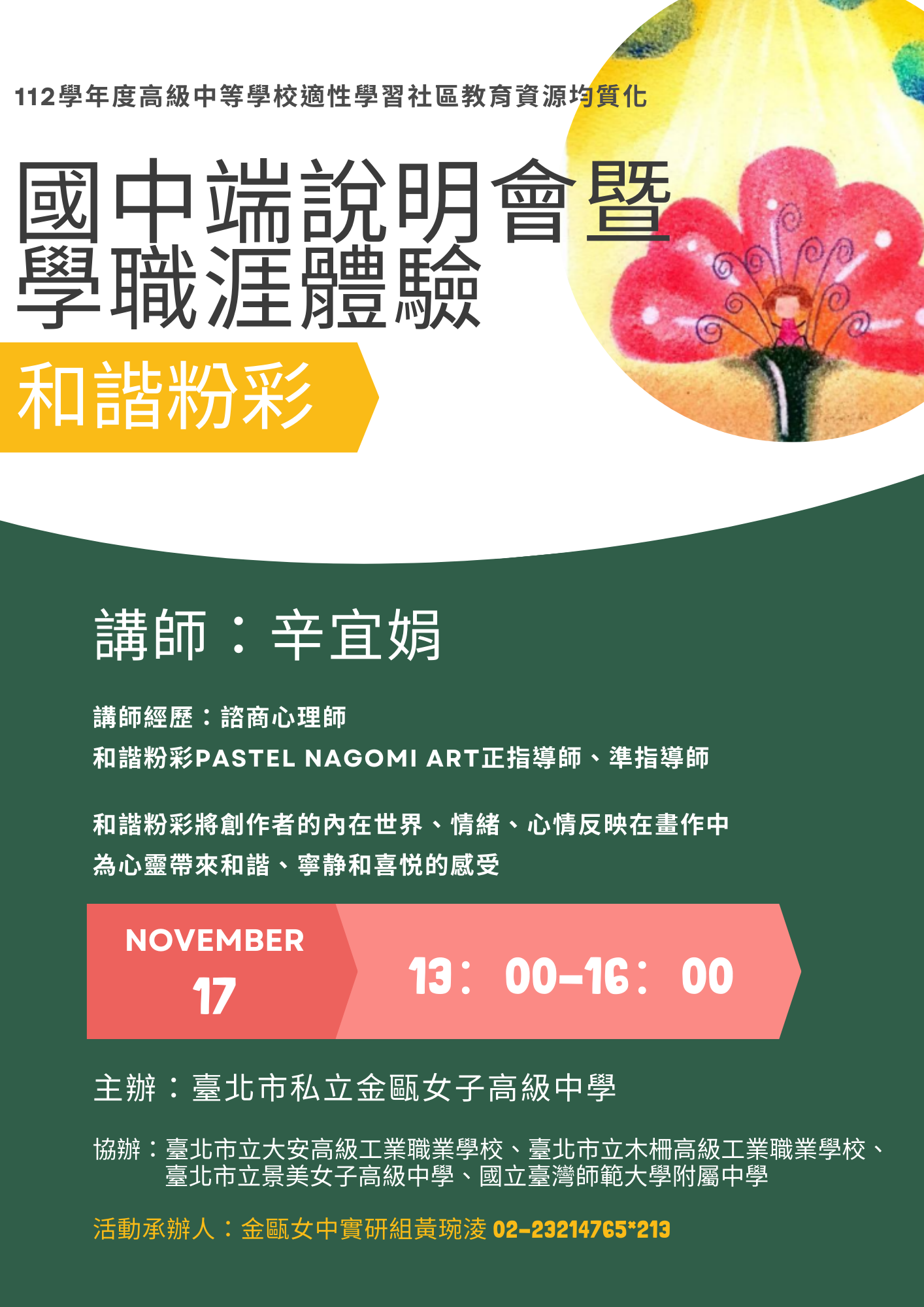 一、目的:為使國中端教師了解北市三區均質化聯盟五校(金甌女中、大安高工、木柵高工、景美女中、師大附中)學校課程,安排本次說明會暨技職體驗活動。