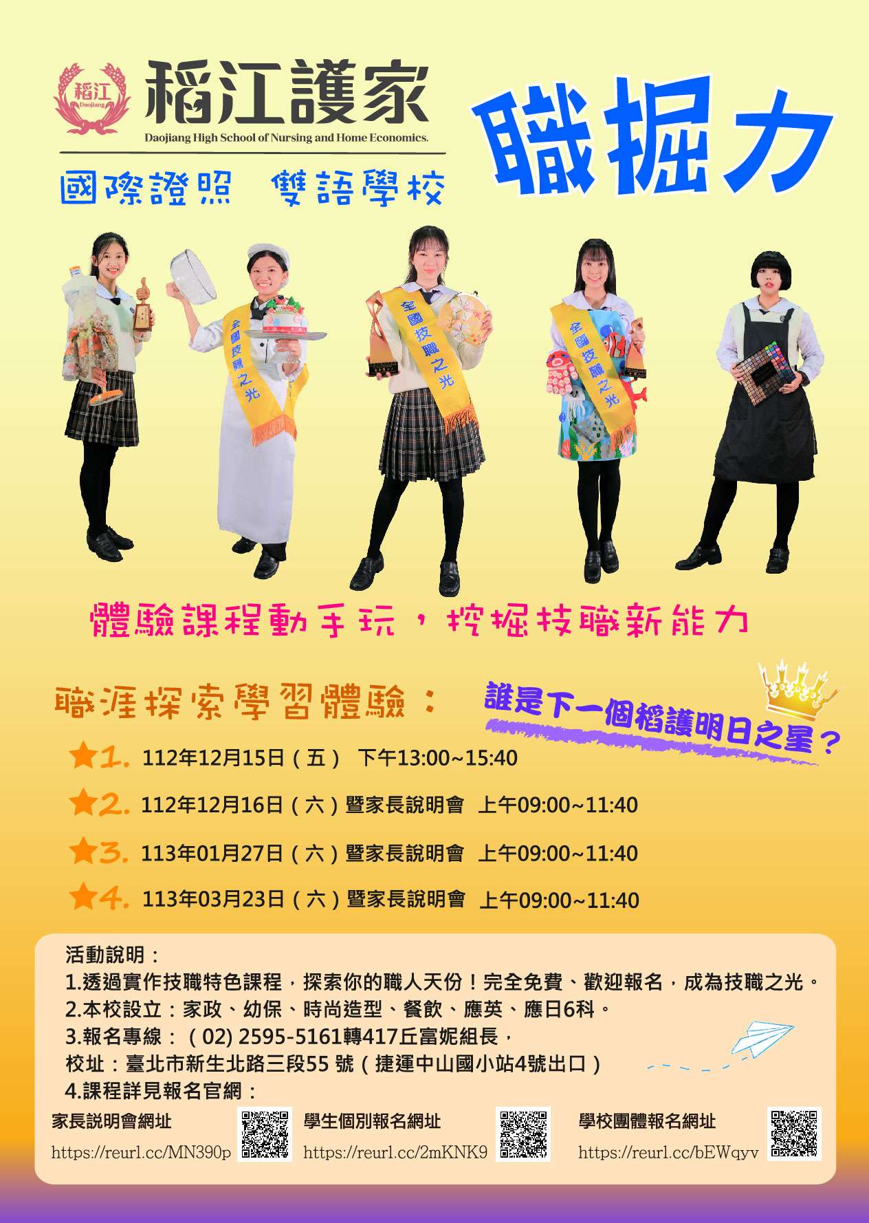 「稻江護家職掘力實作體驗」,誠摯邀請八、九年級學生參加,並歡迎教師或學生家長共同參與。