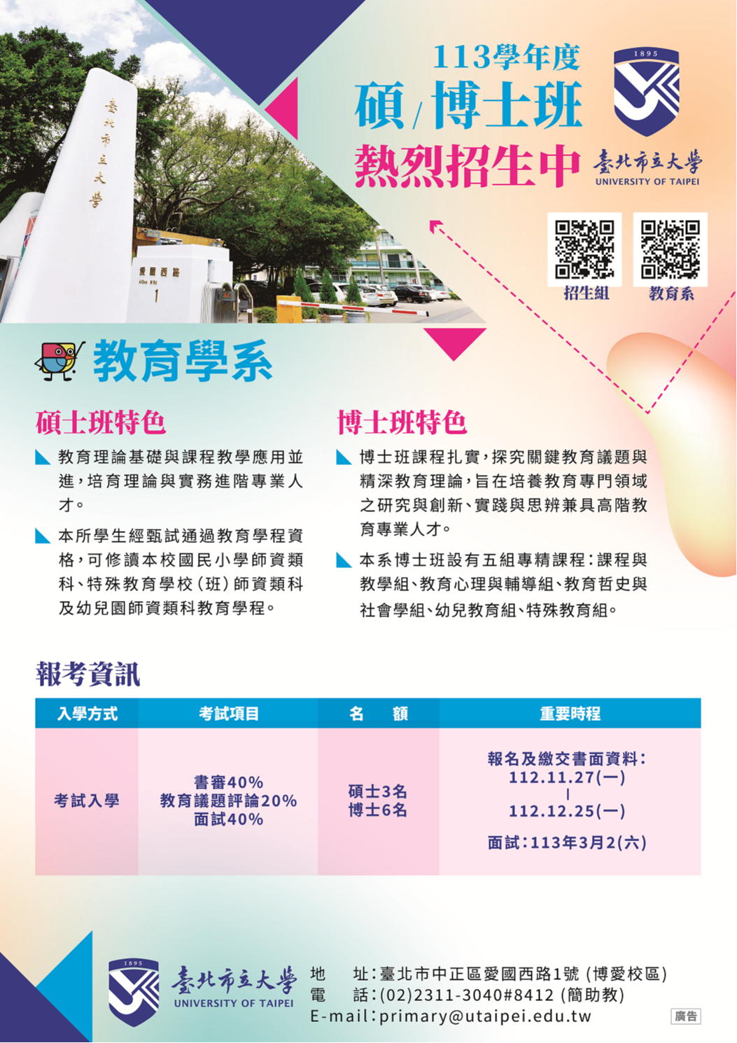 檢送臺北市立大學教育學系「113學年度碩士班暨博士班考試入學」招生海報1份