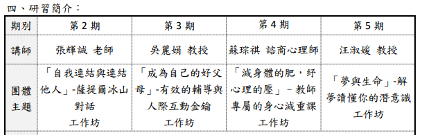 參加對象、人數:本市所屬各級學校(含附設幼兒園)教 師,每期工作坊30人。