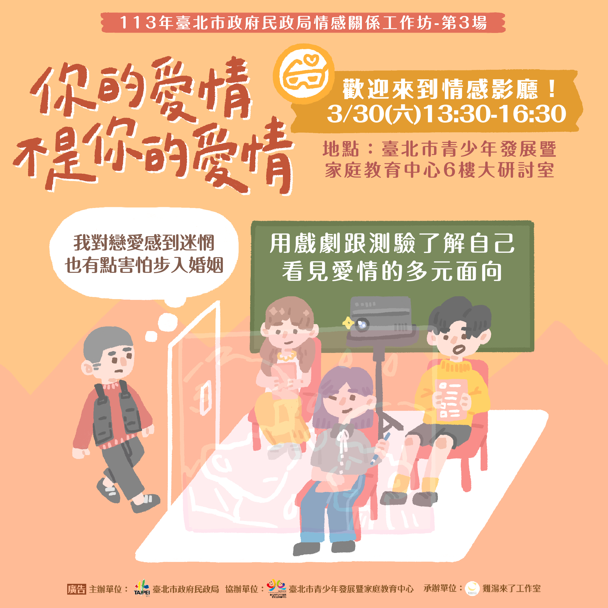 二、第3場次工作坊自即日起至113年3月3日受理報名,採線上表單報名,凡在臺北市設籍、居住、就學及就業,25至45 歲之單身市民即可報名參加,