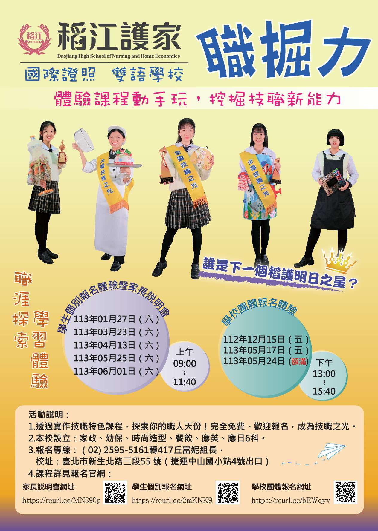 一、本學期於113年3月23日(六)、4月13日(六)、5月17日 (五)、5月25日(六)、6月1日(六)辦理「稻江護家職掘力實作體驗」,誠摯邀請貴校八、九年級學生參加,並歡迎貴校教師或學生家長共同參與。