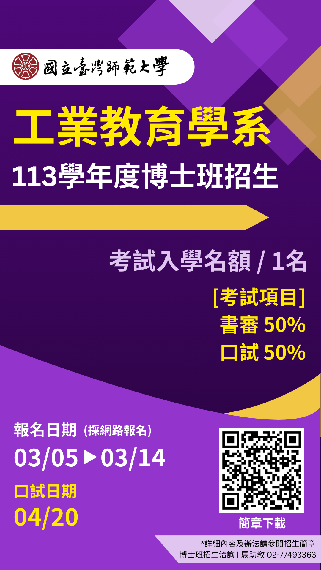 檢送國立臺灣師範大學工業教育學系「113學年度博士班考試入學」招生資訊
