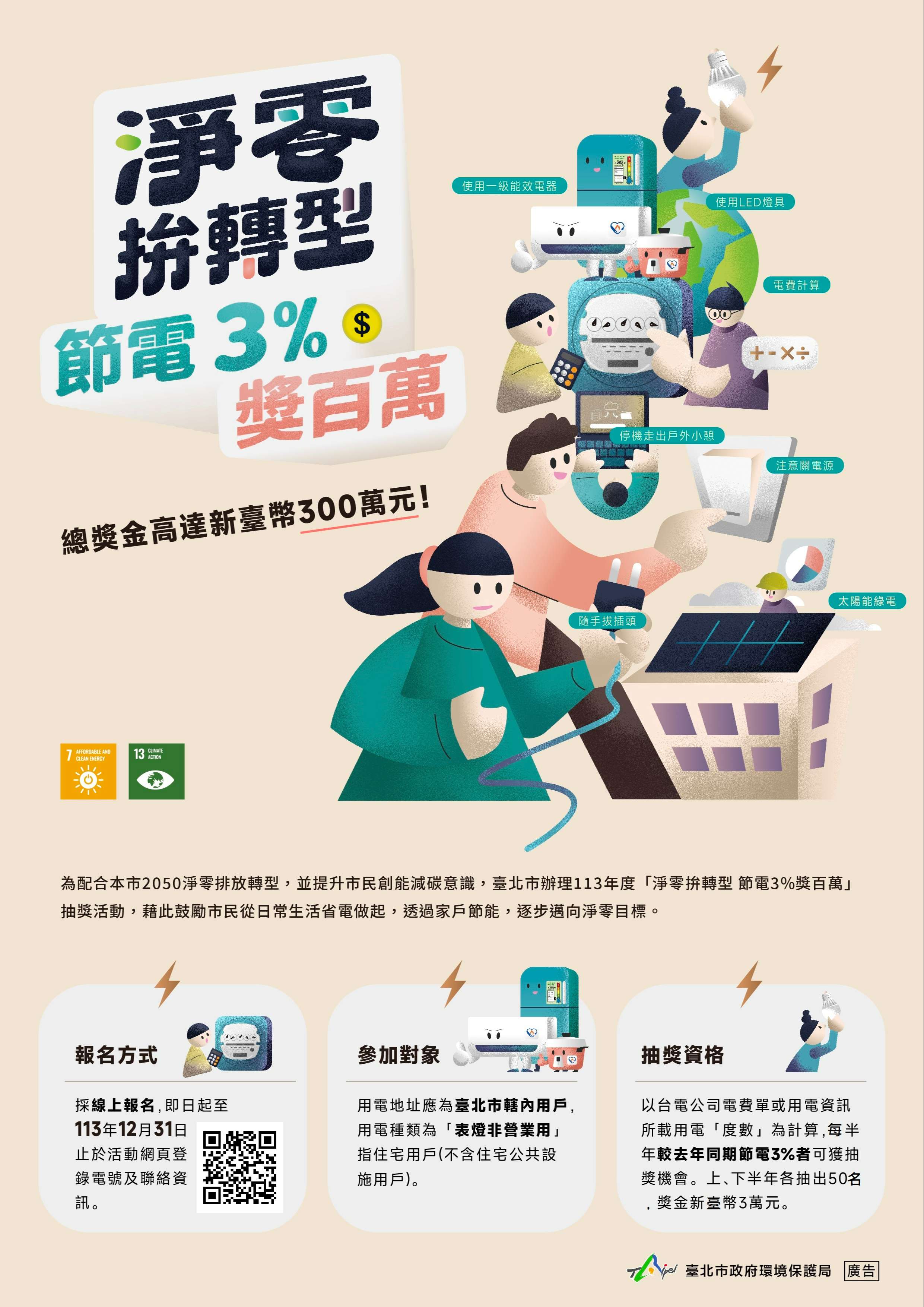 環境保護局為鼓勵市民落實節能減碳行動,即日起至 113年12月31日辦理「淨零拚轉型節電3%獎百萬」抽獎活 動,參加對象為臺北市轄內「住宅用戶」,每半年較去年同期節電達3%即可參加抽獎,113上下半年各抽出50名,每名獎金新臺幣3萬元。