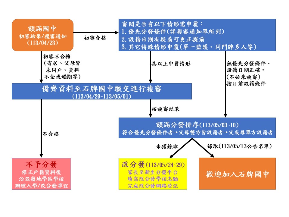 2.設籍資料初審不合格者,恐無法參加分發入學,請於戶籍資料修正後前來複審或逕洽新設籍地之學區學校辦理入學或改分發事宜。