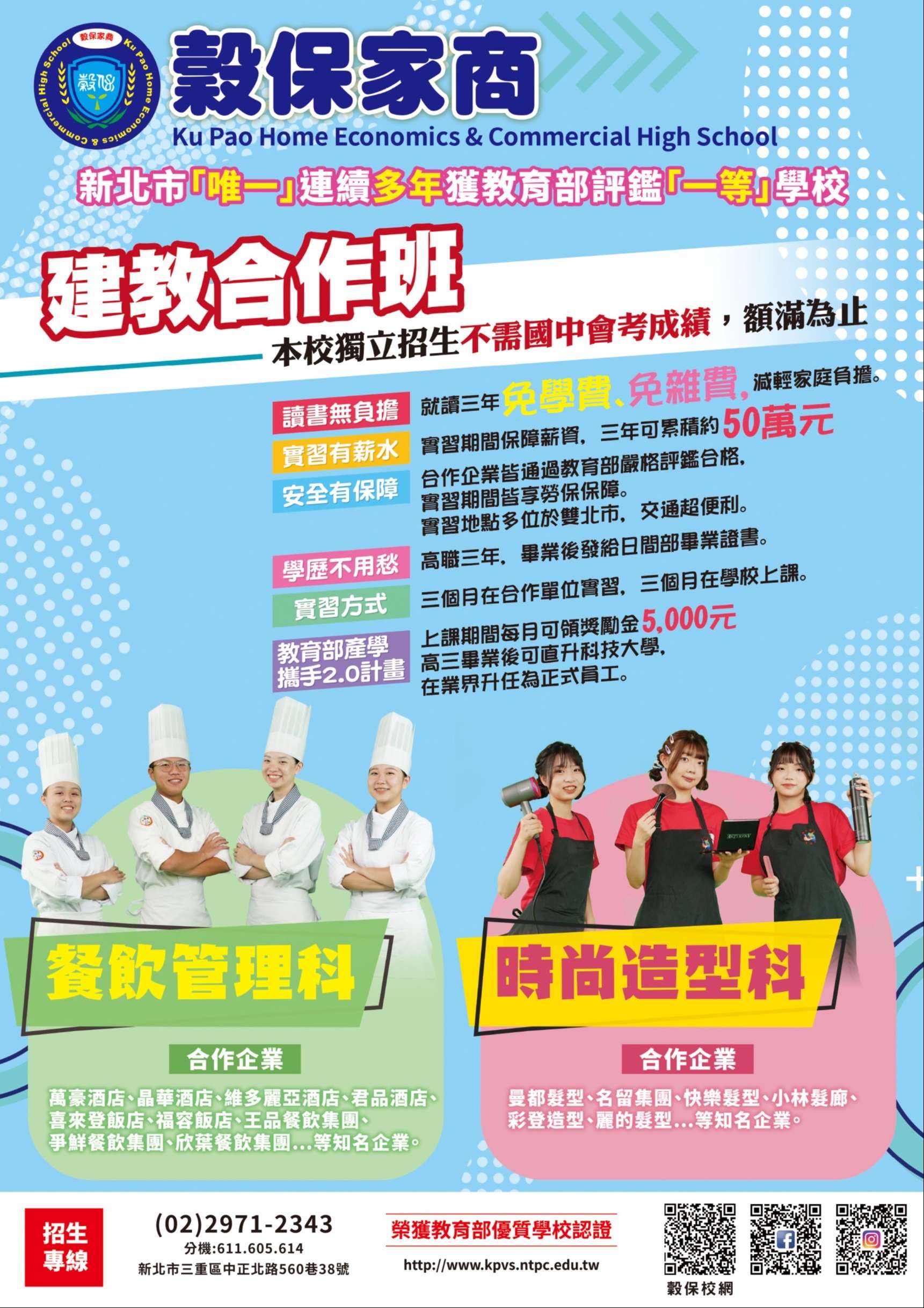 二、報名本校建教合作班免會考成績,三年皆免學費、免雜費,三年實習津貼約50萬元,招生簡介如附件。