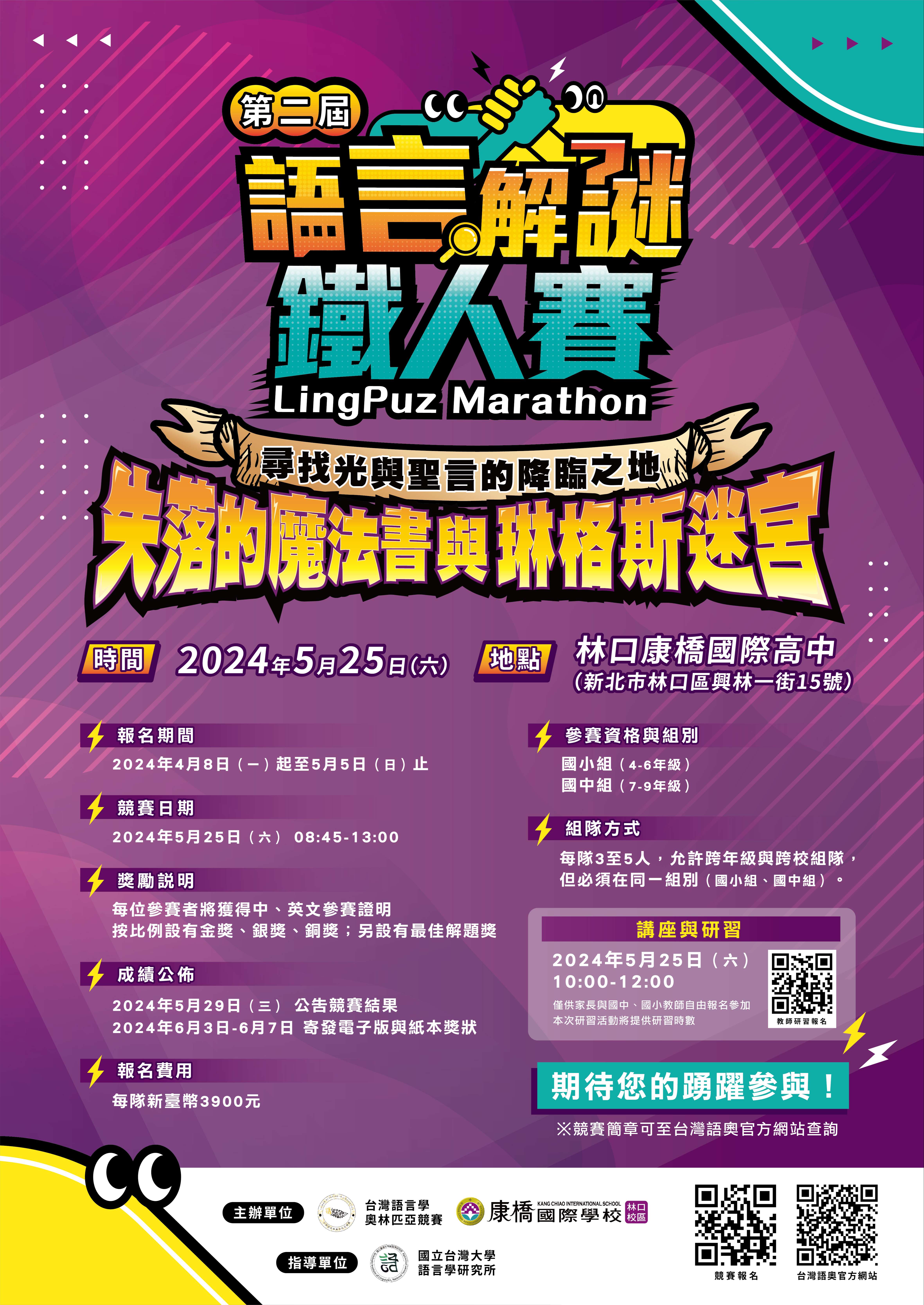 臺灣大學語言學研究所將於113年5月25日,假林口康橋國際高中舉行「2024年第二屆語言解謎鐵人賽」,針對國中(七年級至九年級)、國小 (四年級至六年級)學生推廣臺灣語言學奧林匹亞競賽