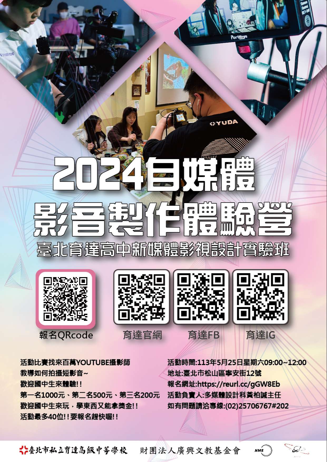 一、「新媒體影視設計實驗班」為國內首創,本次活動找來百萬 YOUTUBER攝影師、東森攝影記者教導如何拍影片及製作短影音拍YOUTUBE、攝影直播等專業技能,歡迎國中生來體驗!!