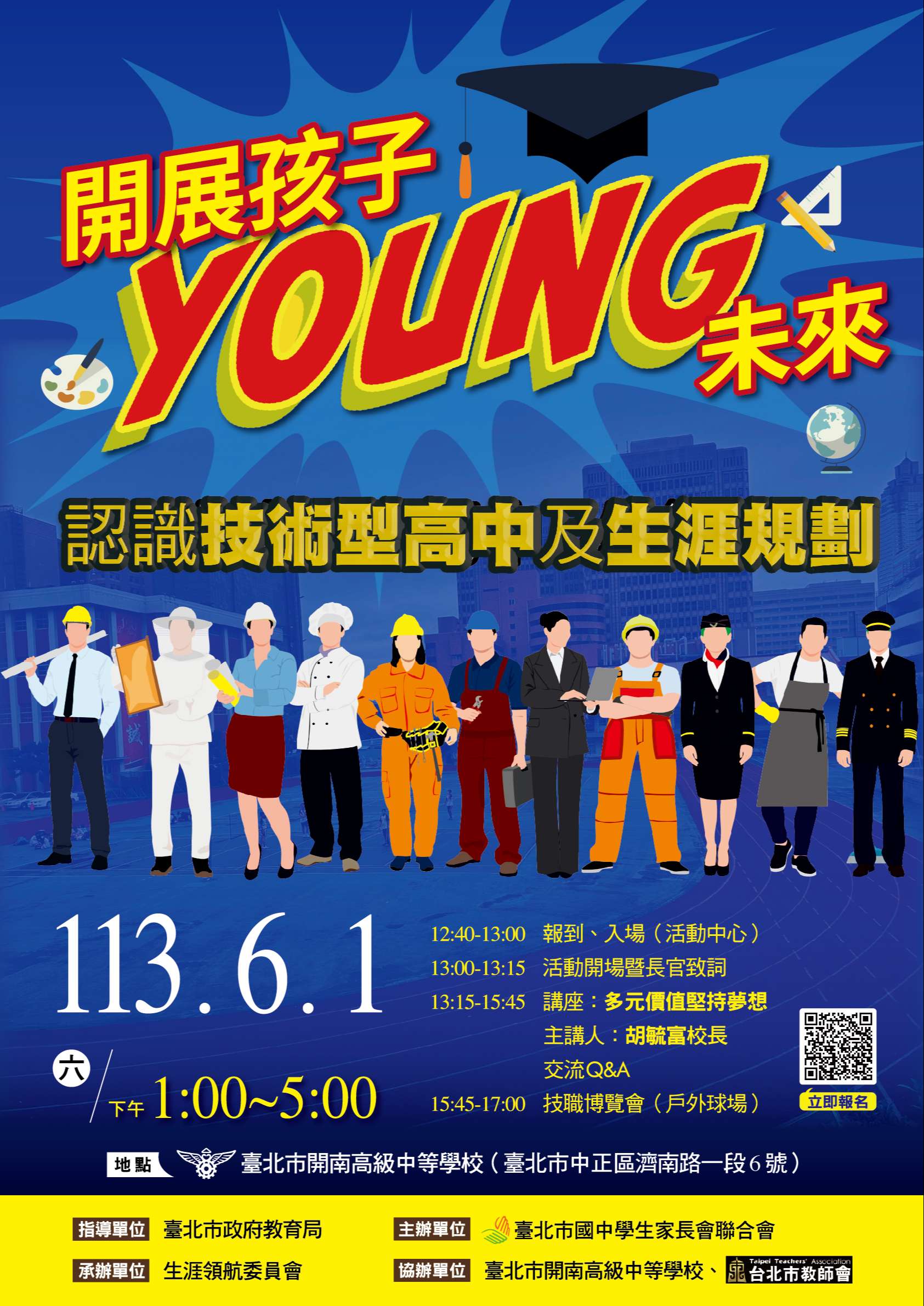 為提升學生及家長對技術型高中的認識,以利學生未來生涯規劃,本市國中學生家長會聯合會辦理旨揭活動,活動訊息如下: