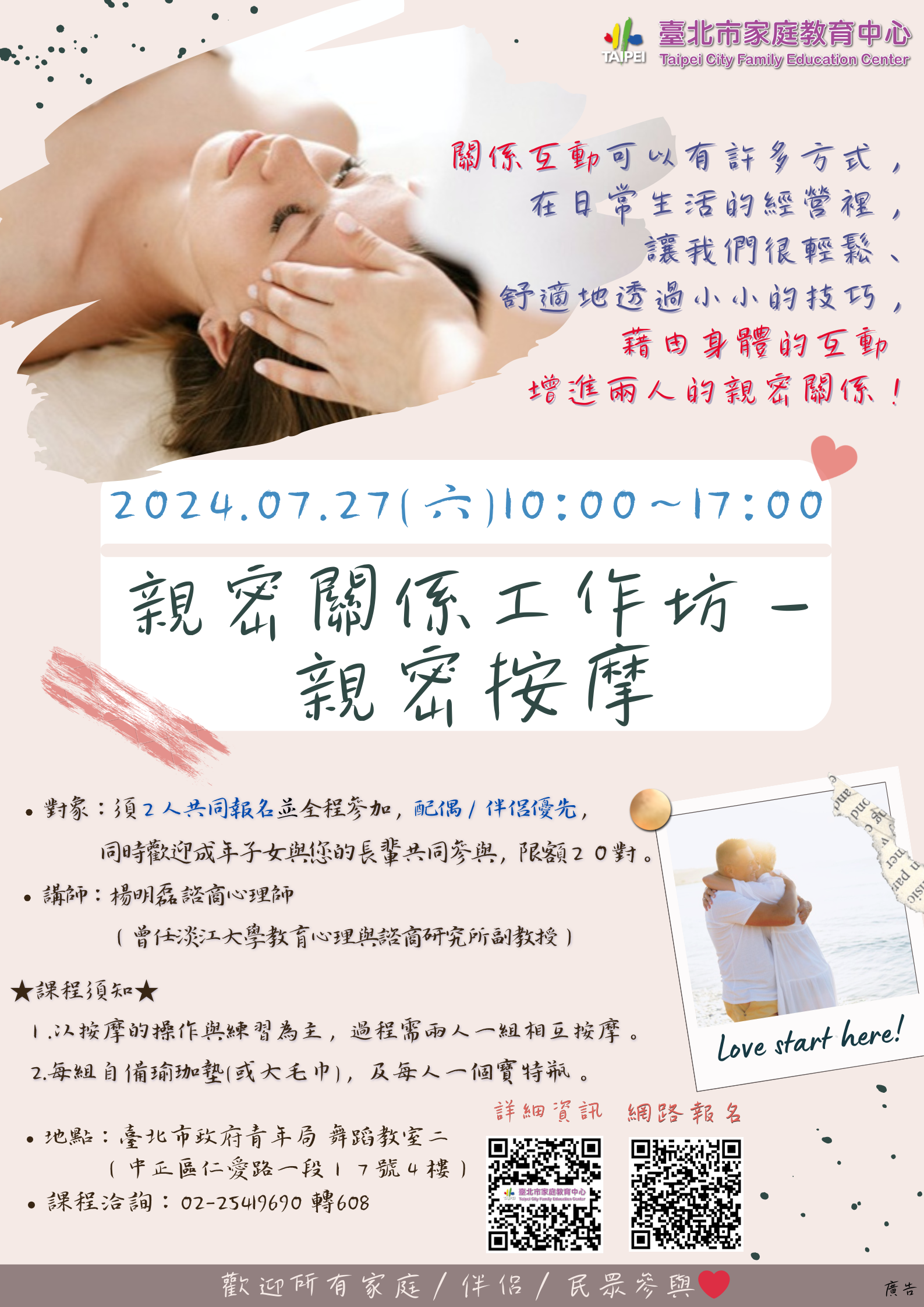 本課程訂於113年7月27日(星期六),藉由身體的互動輔 以輕鬆、舒適的技巧,增進彼此的親密關係;對象以配偶 或親密伴侶為優先,兩人全程共同參與,公務人員及本市 教師可申請終身學習(研習)時數。