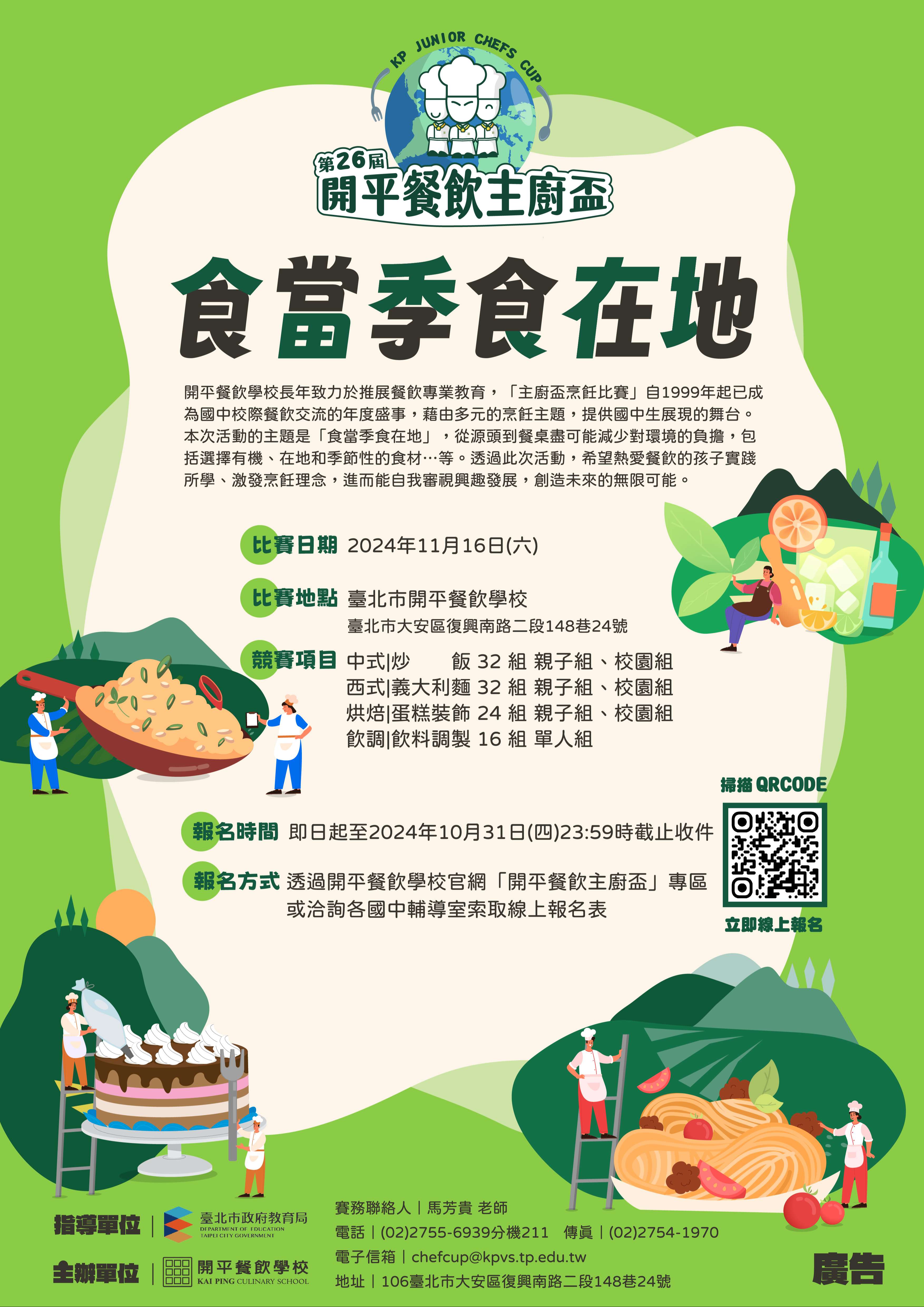 九、相關比賽辦法,報名資訊如附件,詳細比賽資訊請參閱 第26屆開平餐飲主廚盃網頁(https://sites.google.com /kpvs.tp.edu.tw/kpvsjcc)
