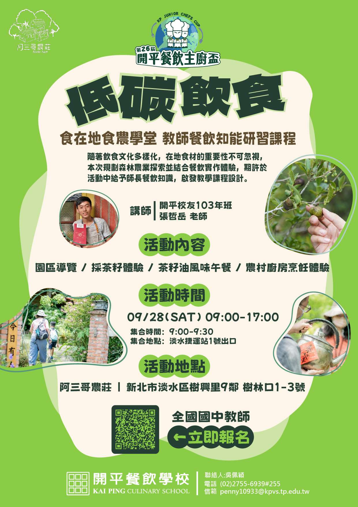一、本次活動主題為低碳飲食且融入「食農教育」,透過實作體驗更加了解技職體系,進而發揮協助學生適性就學選擇之輔導。