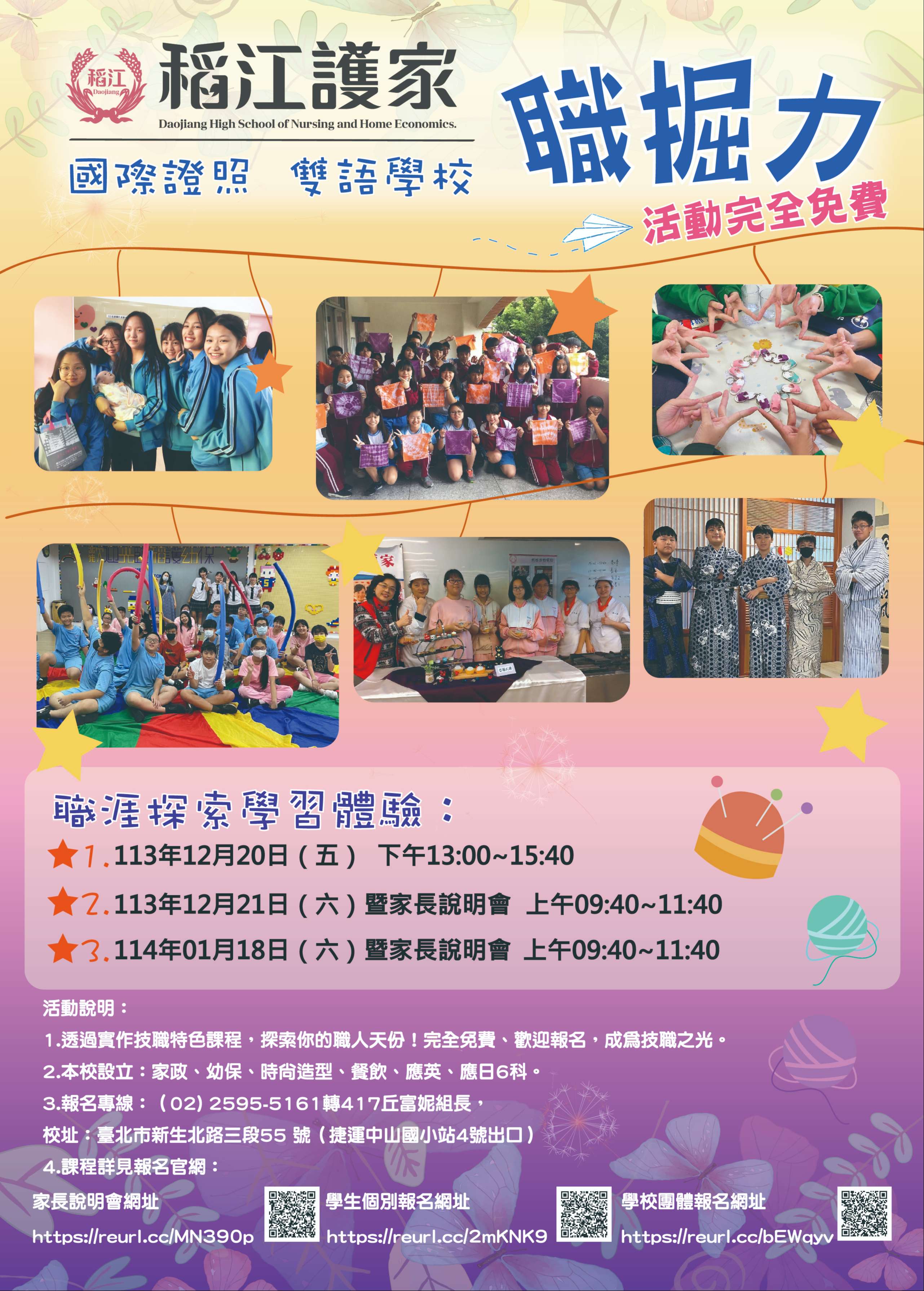 二、本學期於113年12月20日(五)、12月21日(六)、114年1月18 日(六)辦理「稻江護家職掘力實作體驗」,誠摯邀請八、九年級學生參加。