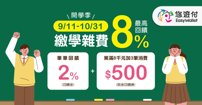 (二)活動內容:活動期間當月使用悠遊付每筆扣款享2%悠遊付回饋金,另累積消費新臺幣(以下同)8,000元加3筆消費即回饋500元現金回饋券,活動期間每戶最高回饋8%悠遊付回饋金(或回饋券)。