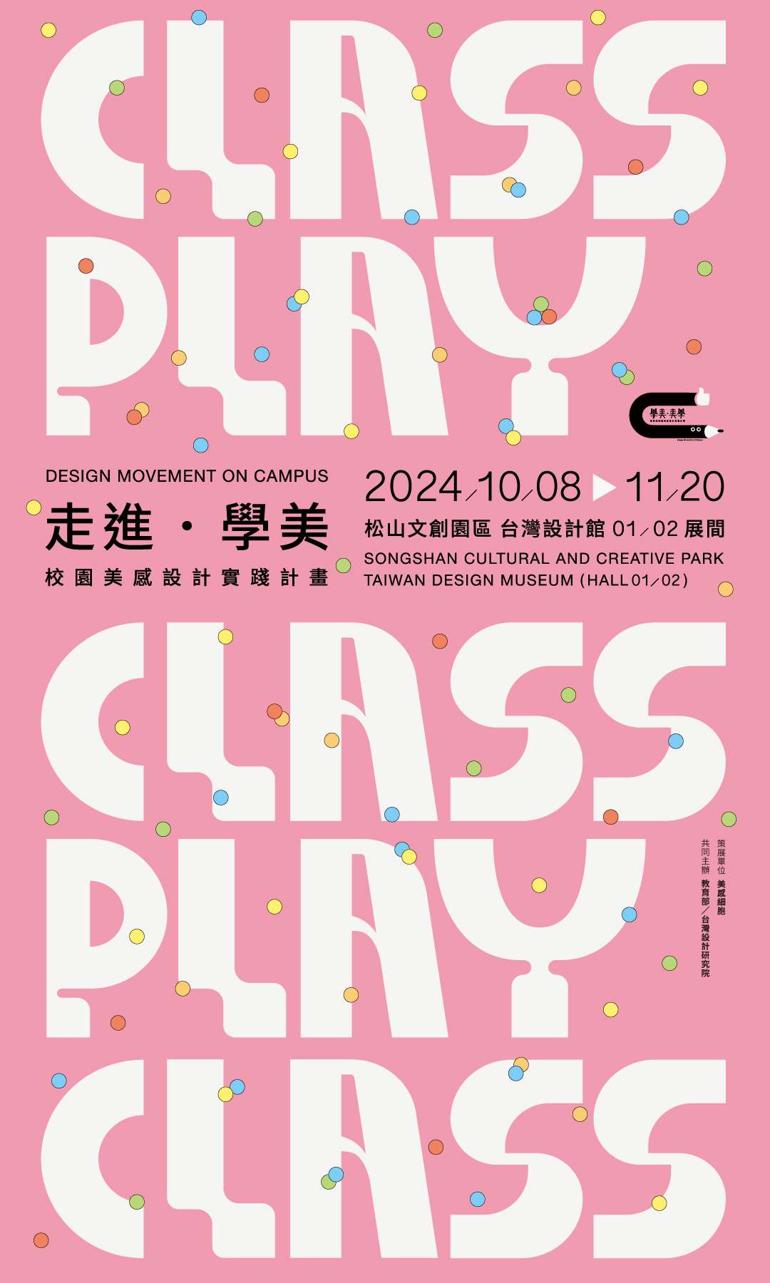 二、「CLASSPLAY 走進・學美」免費參觀,展期至11月20日, 透過「學美・美學-校園美感設計實踐計畫」5.0 改造案 例解析,一探學校與專業設計團隊是如何進行共創,導入 設計思考與方法,為台灣各級學校提供符合教育趨勢、具 有美感,滿足教學需求的學習環境,實踐「為學習做設 計」的精神。