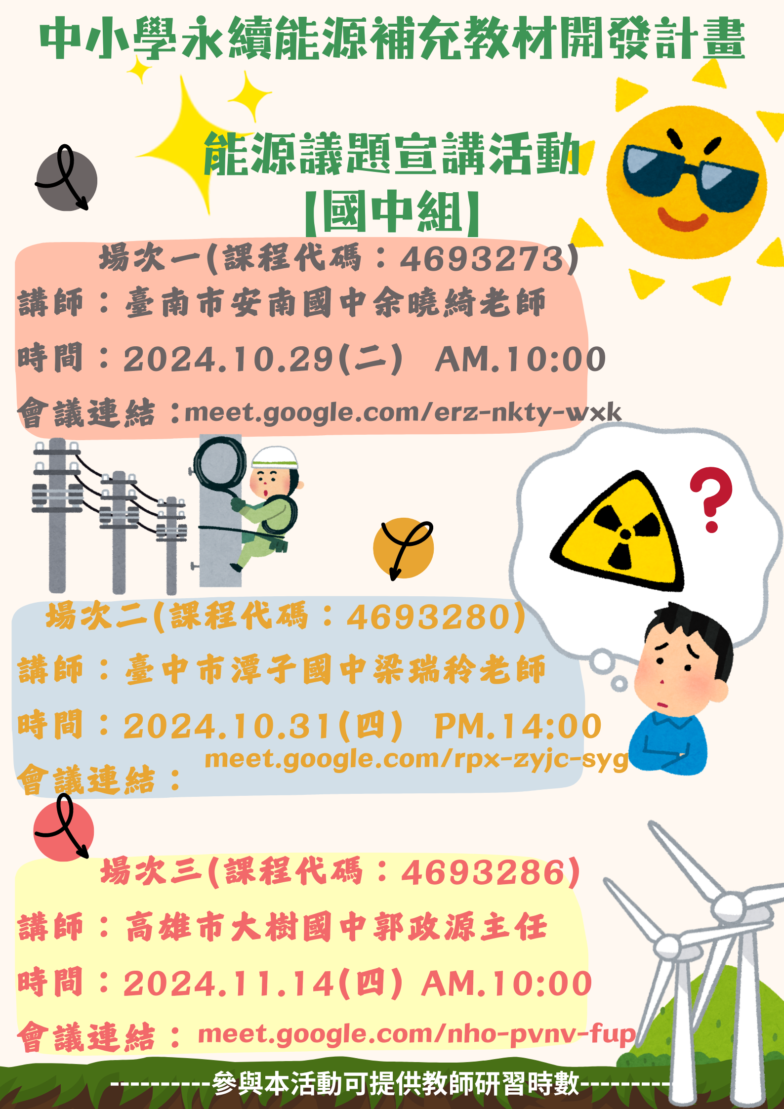 (四)【國中組】場次一(課程代碼:4693273);講師:臺南市安南國中余曉綺老師;時間:113年10月29日(星期二)上午10時0分至11時30分;Google Meet連結:meet.google.com/erz-nkty-wxk。