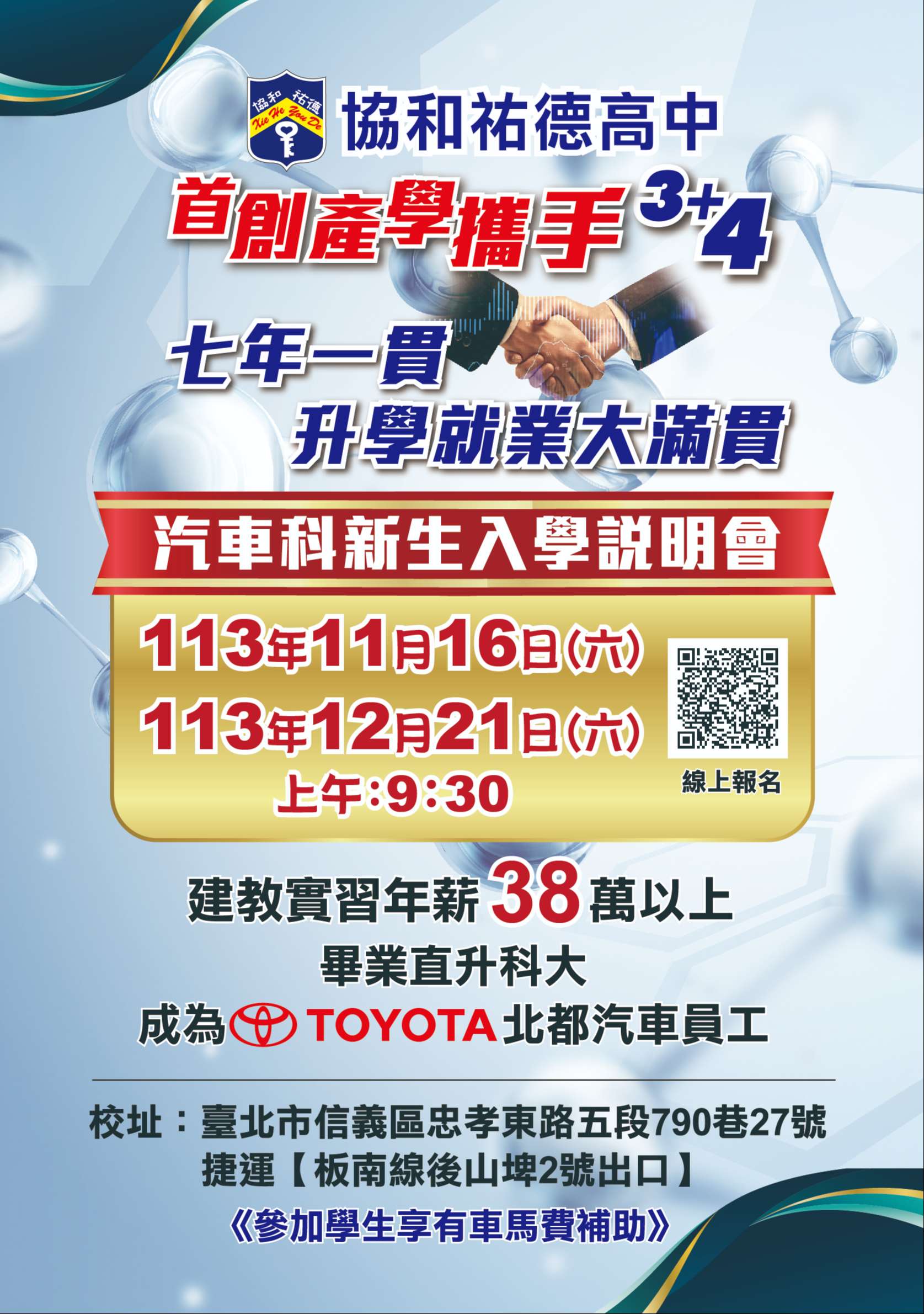 1.優勢說明:建教實習年薪30萬以上、畢業直升東南科技大學、成為TOYOTA北都汽車正式員 工。
