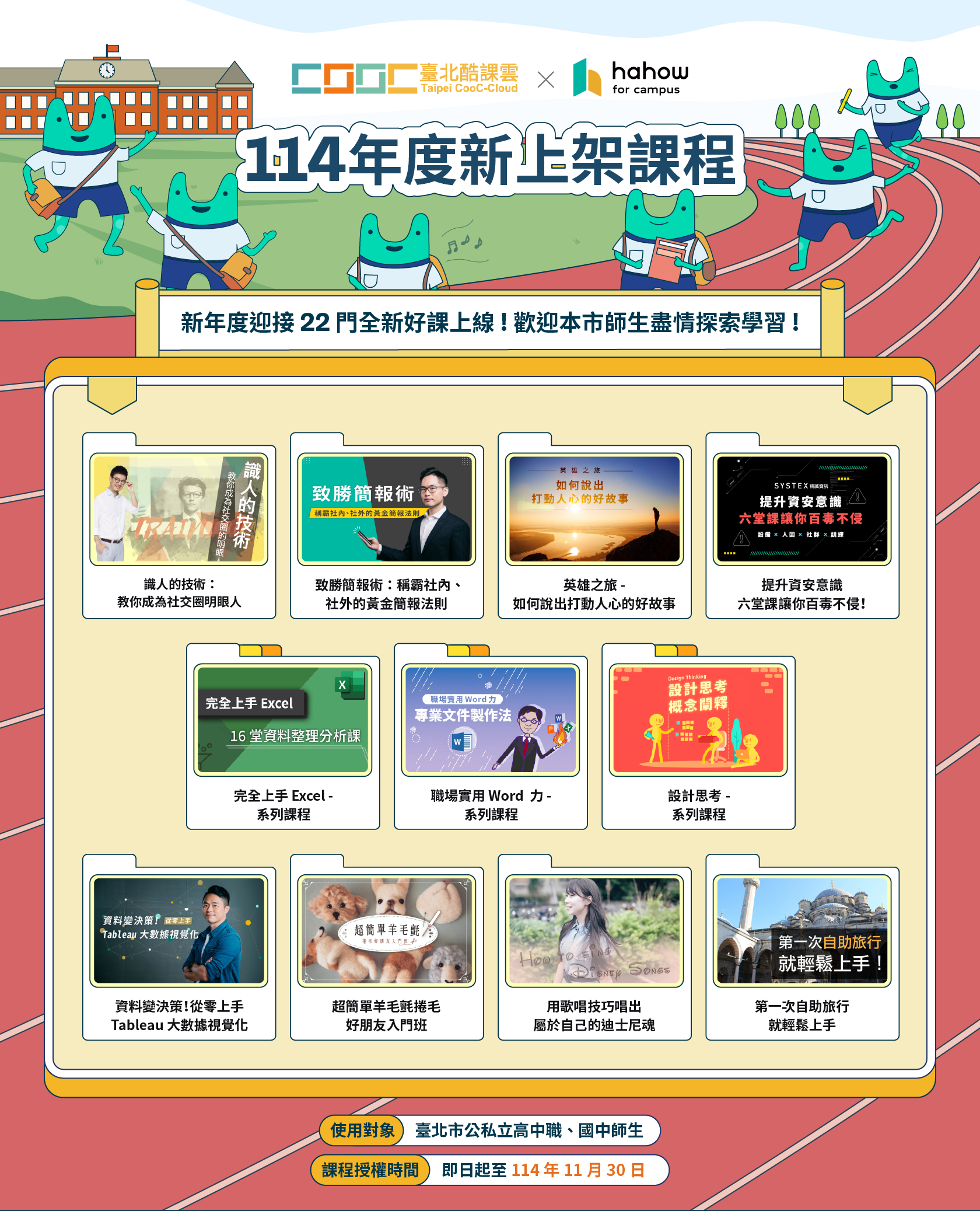 二、旨揭課程服務將自114年1月1日(星期三)起更新部分課程 內容,並由原先70門課程擴增至111門,課程服務簡介說明 如下: (一)適用對象:本市公私立高中職及國中師生。 (二)課程授權期限:即日起(114年度新上架課程授權自114 年1月1日起)至114年11月30日止。(三)課程專區:至臺北酷課雲(https://cooc.tp.edu.tw) 使用「臺北市校園單一身分驗證帳號」登入,於「主題 學習專區」點選「Hahow for Campus」即可進入平臺觀 看課程。