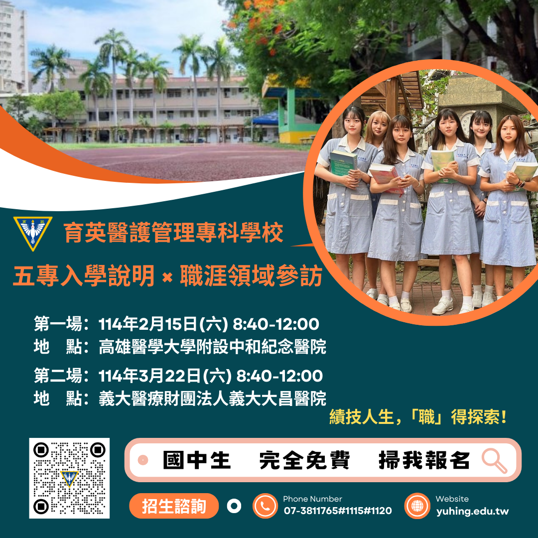 五、洽詢電話:(07)381-1765#1115或1120育英醫專教務處綜合業務組。