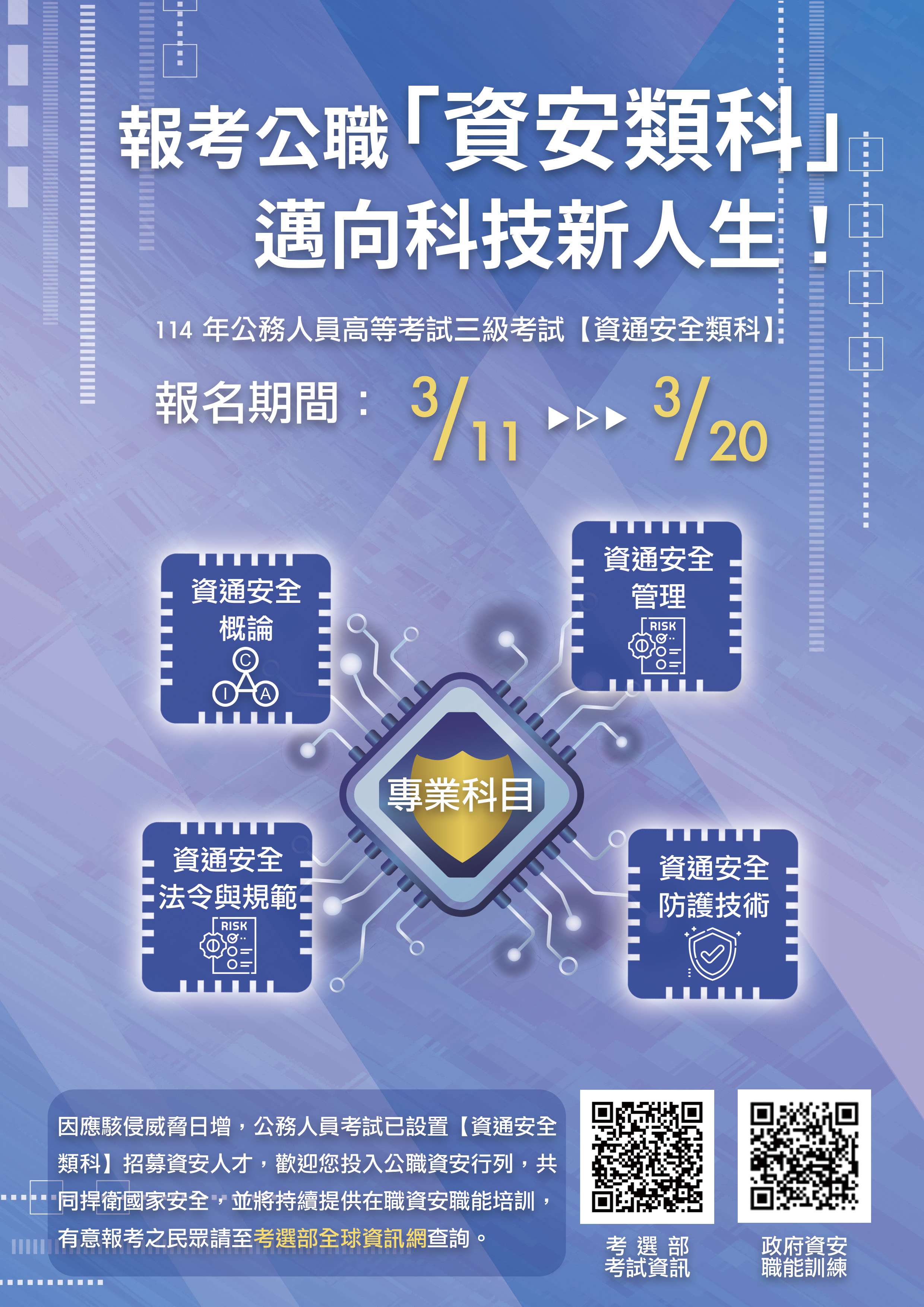 因應駭侵威脅日增,公務人員考試已設置【資通安全類科】招募資安人才,歡迎您投入公職資安行列,共同捍衛國家安全,並將持續提供資安職能生涯培訓,114年考試自3月11日至3月20日受理網路報名,有意報考之民眾請至考選部全球資訊網查詢。