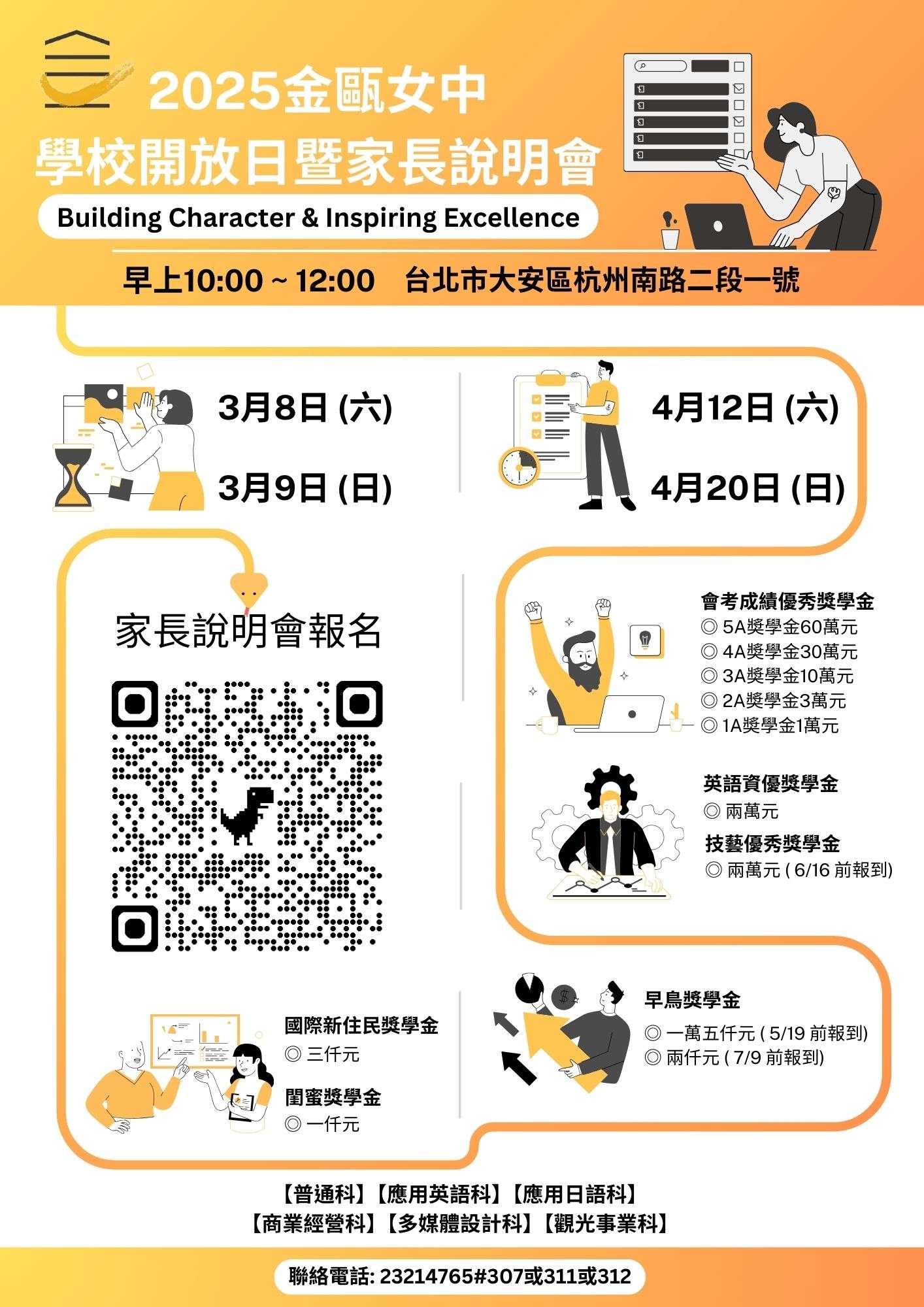 一、定於114年3月8日、9日、4月10日、12日上午10時至12時於金甌女中辦理【招生家長說明會】活動,歡迎 有興趣的家長及學生報名參加。