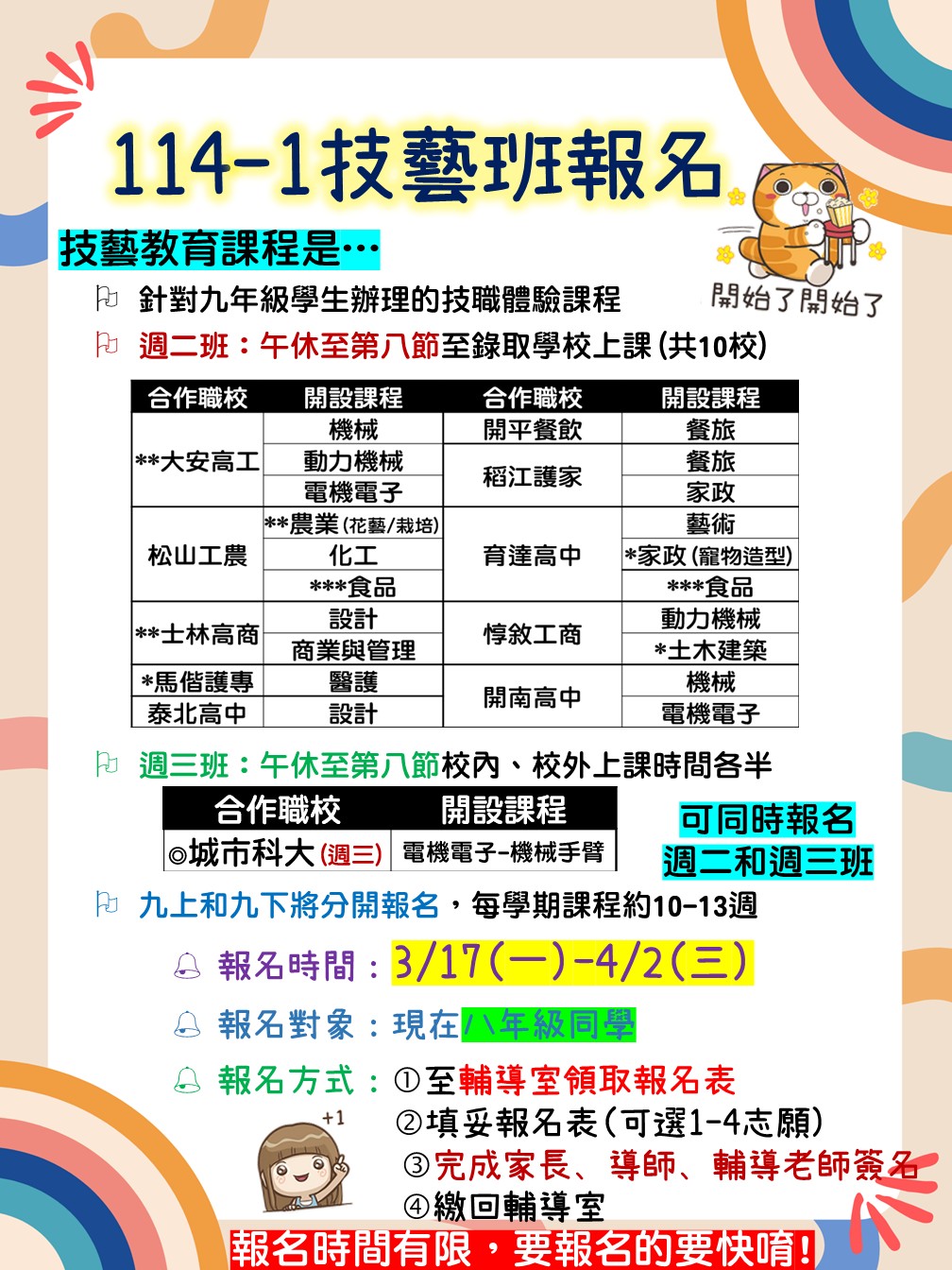 114-1技藝教育課程開始報名了,報名時間為3/17(一)~4/2(三),