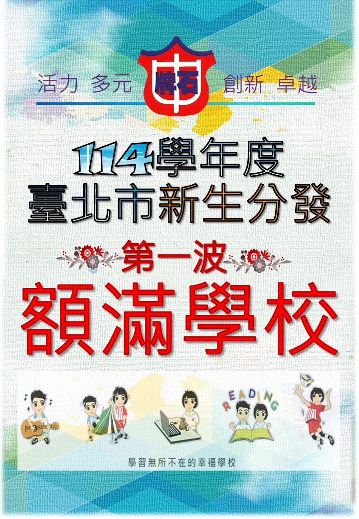 一、本校114學年度新生分發經臺北市政府教育局核定為第一波額滿學校,因無法容納所有設籍學區內臺北市國小畢業生,將依規定進行複審(114/5/05~114/5/07),以排定分發順序(細節請詳閱初審結果/複審通知單、外縣市審查通知單,如下連結請點選)。