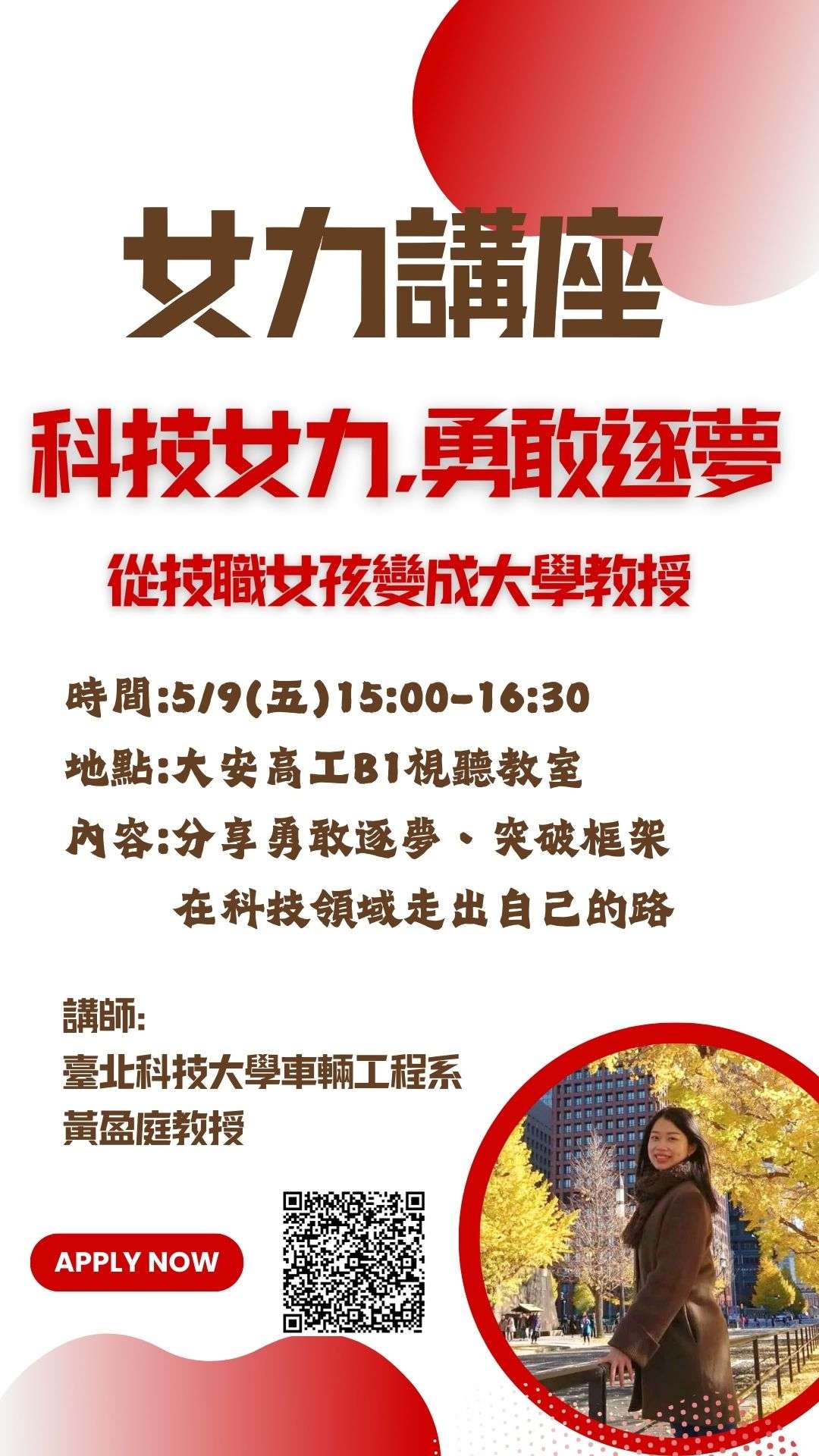 (五)內容:從技職女孩變身大學教授,分享如何勇敢追夢、 突破框架,在科技領域走出自己的路。
