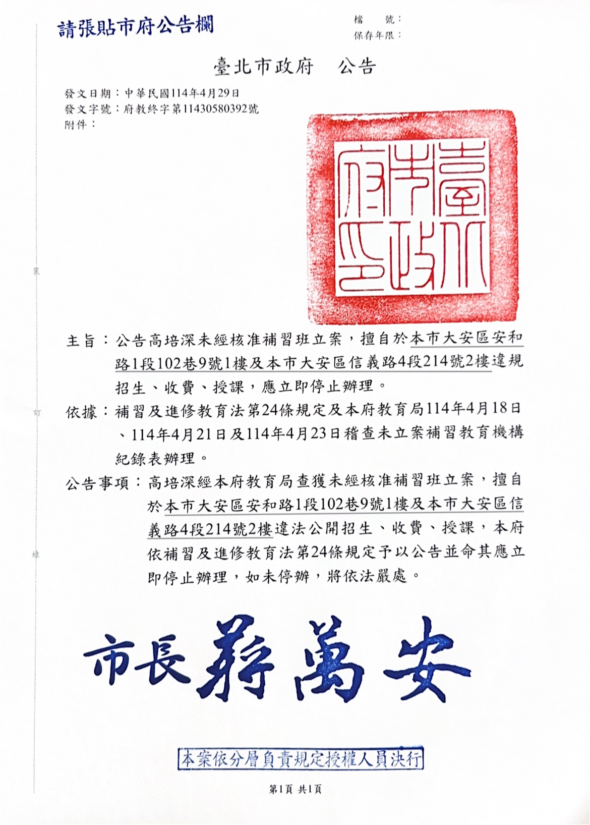 一、依據市府114年4月29日府教終字第11430580392號公告辦