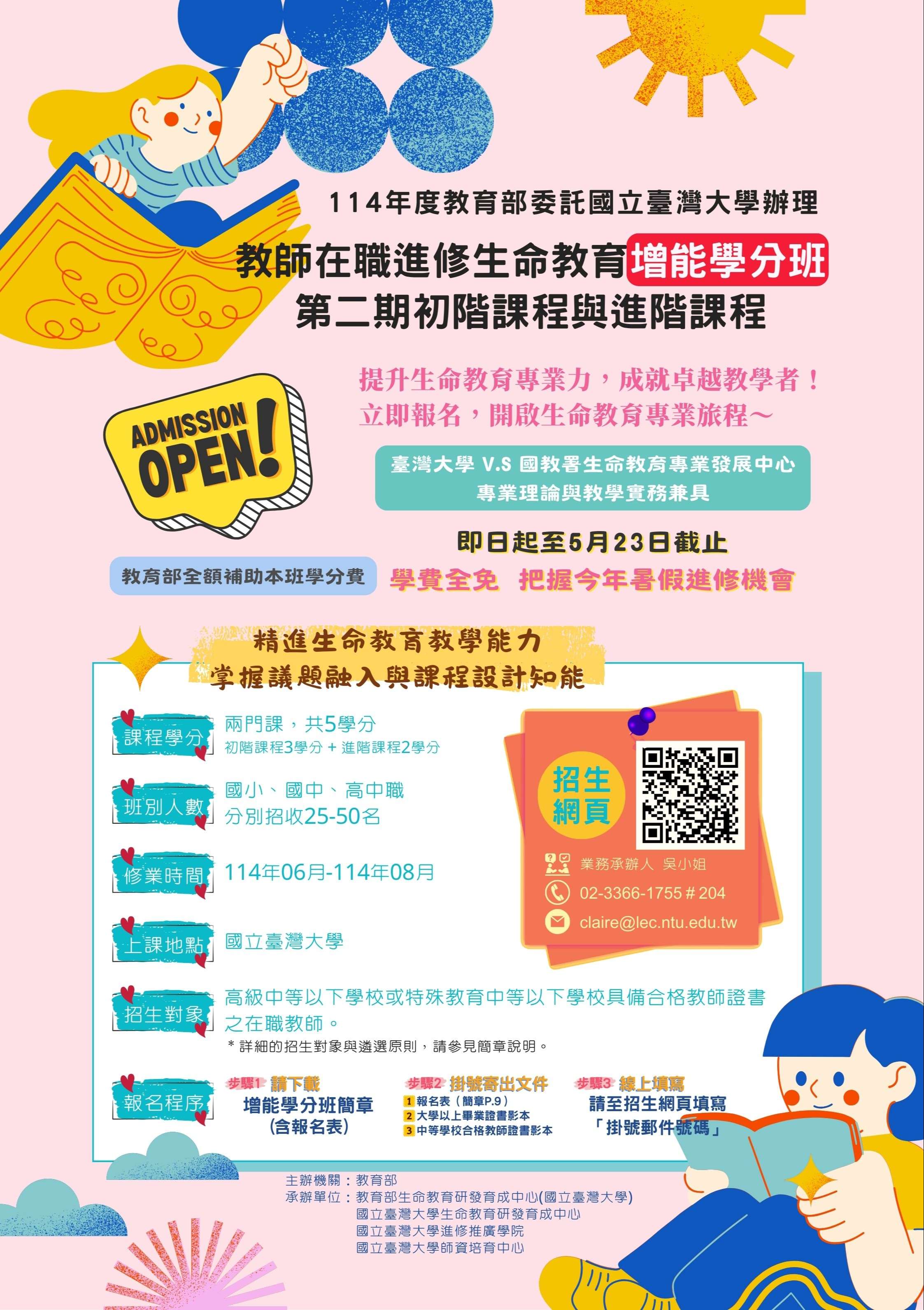 為培育高級中等以下學校之在職教師掌握生命教育核心素養內涵,並具備生命教育議題融入課程之教學知能,教育部特委託本校生命教育研發育成中心辦理旨揭學分班。