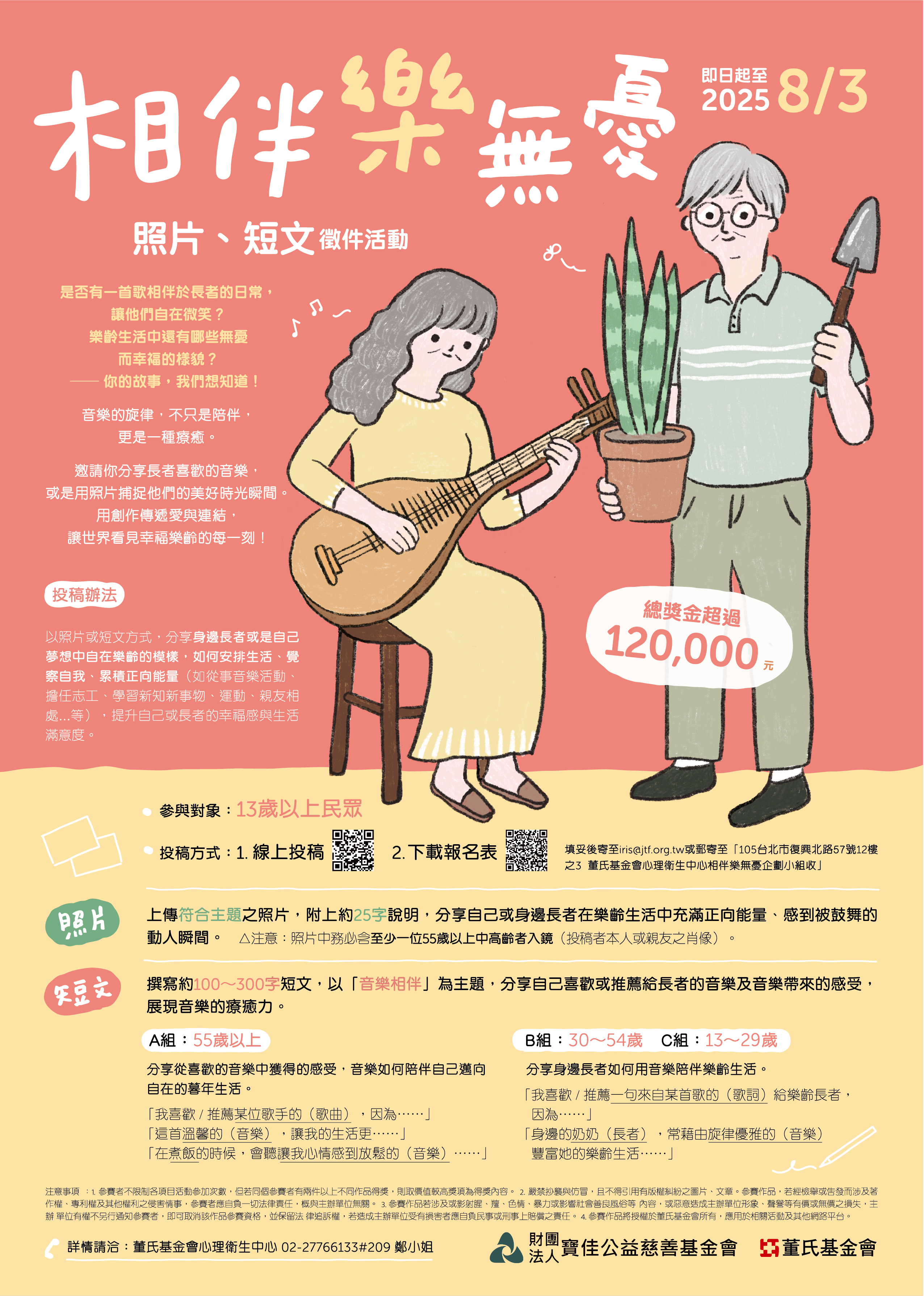 為鼓勵青少年透過活動參與,關心身邊長者心理健康並增加陪伴互動的機會,本會舉辦「相伴樂無憂-照片、短文徵件活動」,即日起開始收件至民國114年8月3日截止。