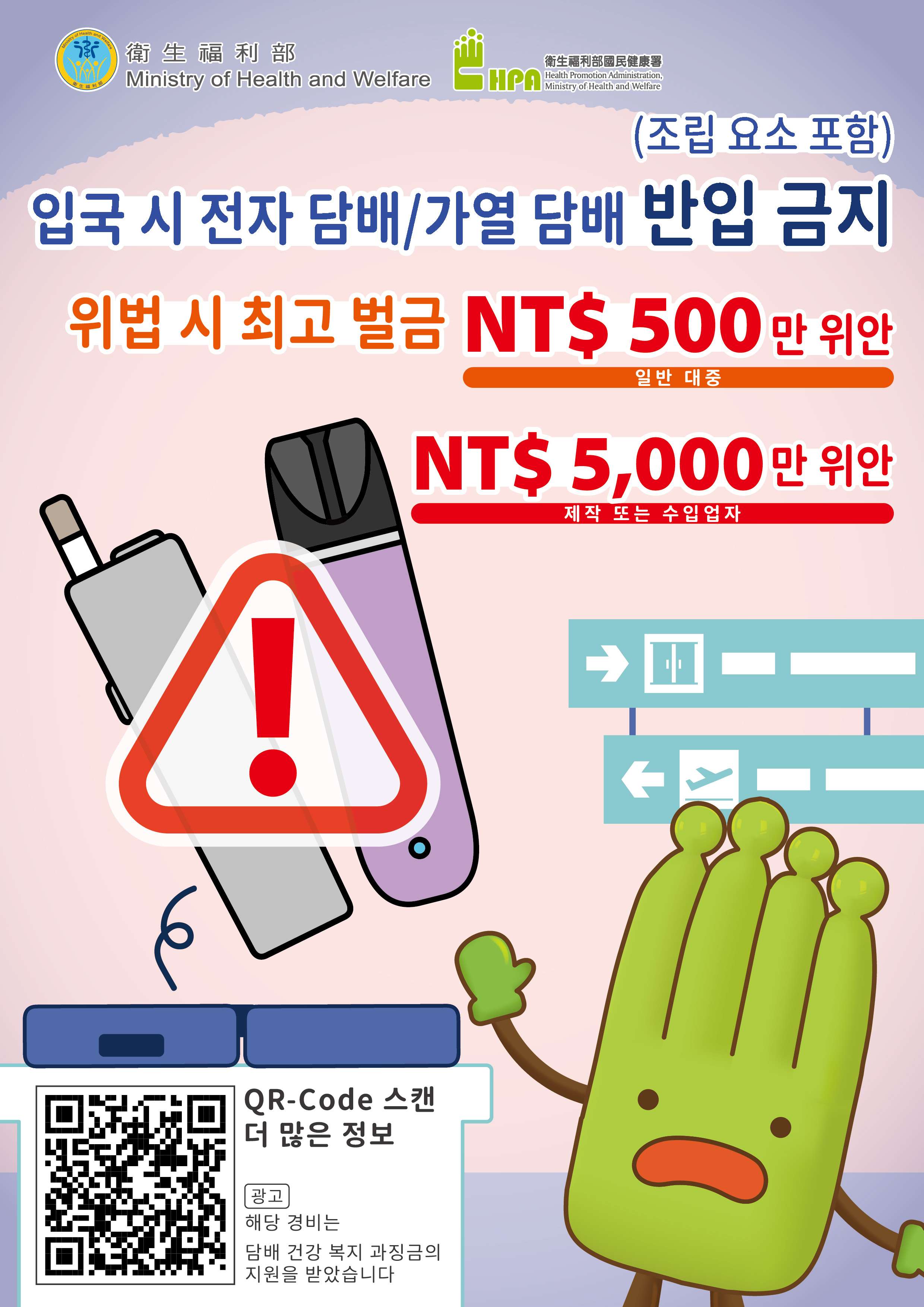衛生福利部製作「禁止攜帶電子煙或加熱菸入境」中、英、日、韓文宣導單張