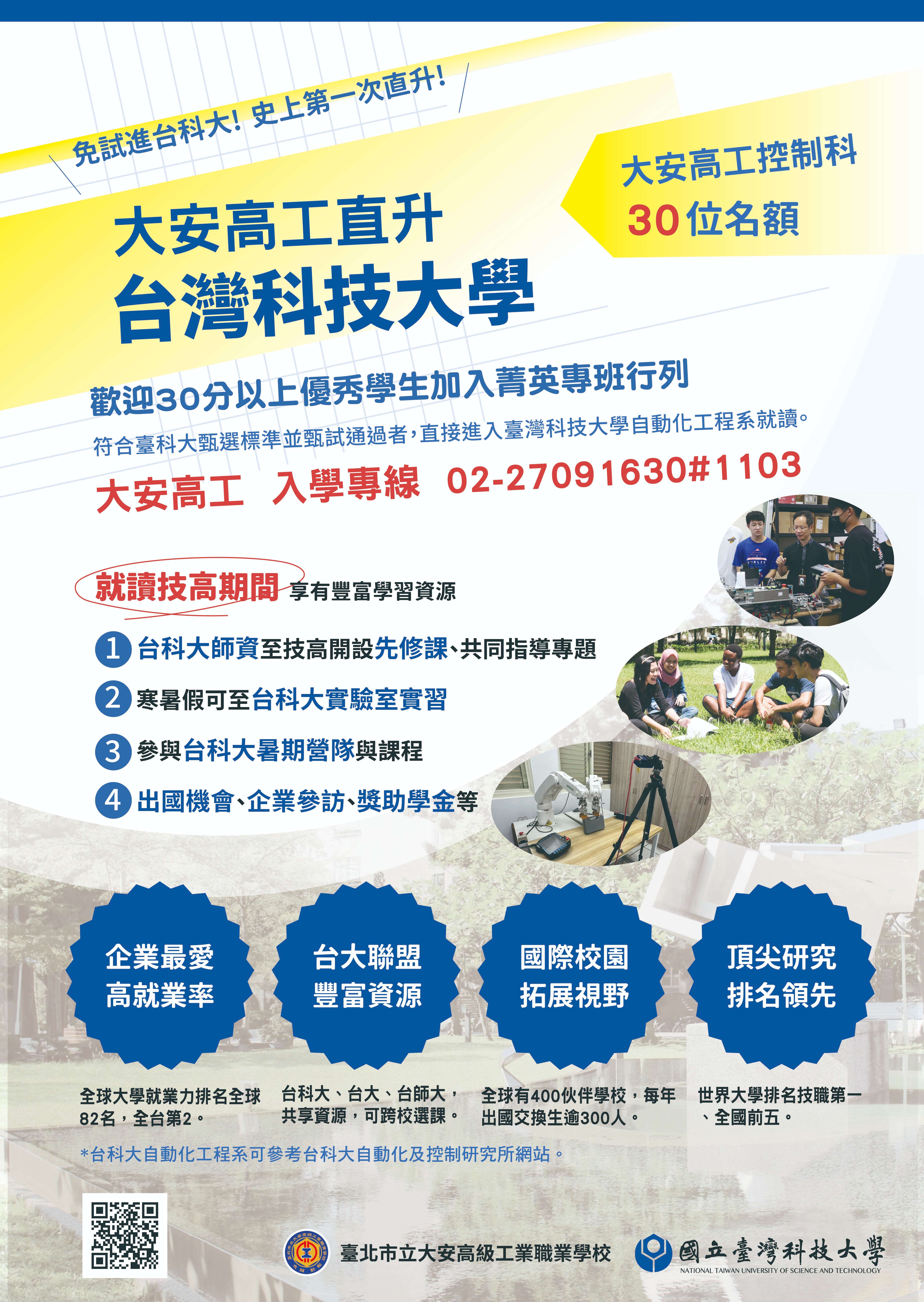 三、相關宣傳海報如附件,倘有任何疑義,請逕洽大安高工教務處,入學專線: (02)27091630轉1103。