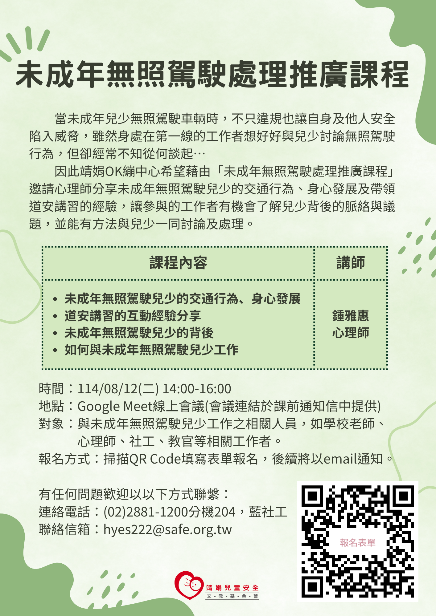 一、依據財團法人靖娟兒童安全文教基金會114年7月4日114靖娟北總字第1140000259號函辦理。