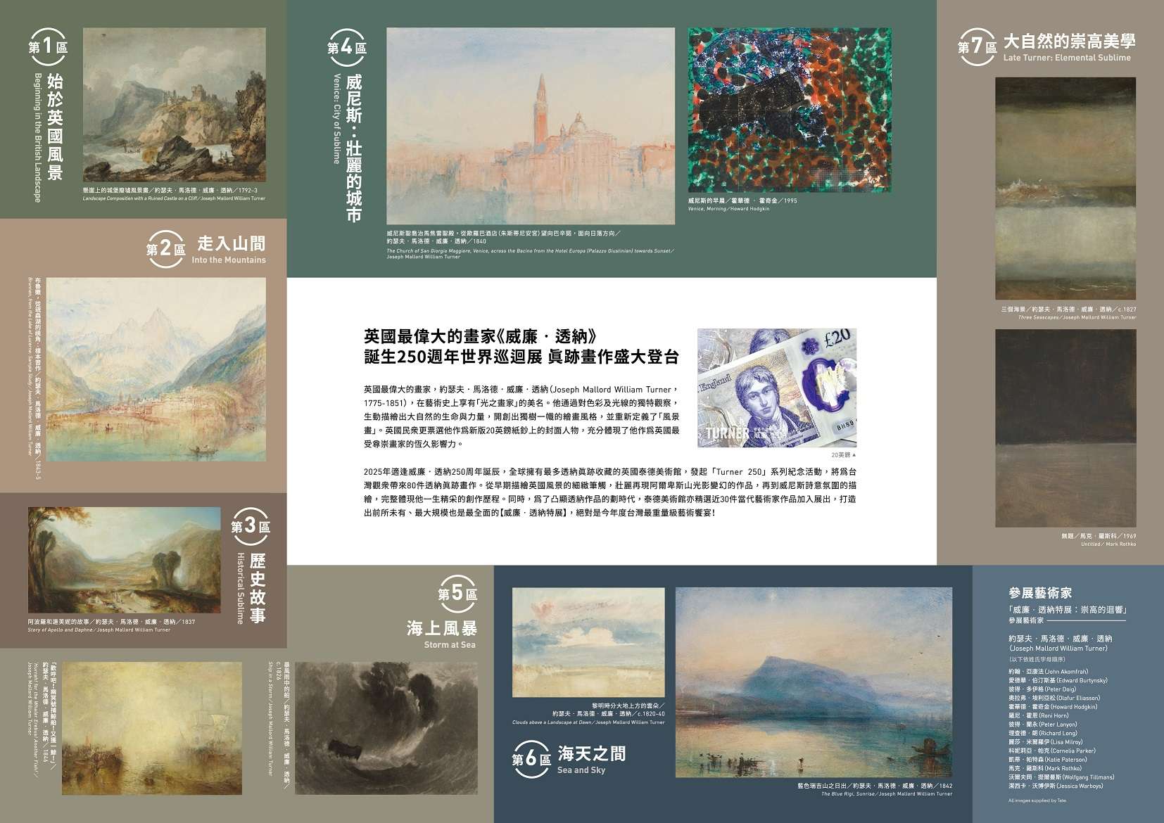 一、展覽說明:「威廉.透納特展:崇高的迴響」展出80件透納真跡畫作,分為七大展區,完整呈現其創作歷程與藝術理念,並加入28件英國泰德美術館精選的當代藝術作品,讓學子體驗藝術的時代對話與想像空間。